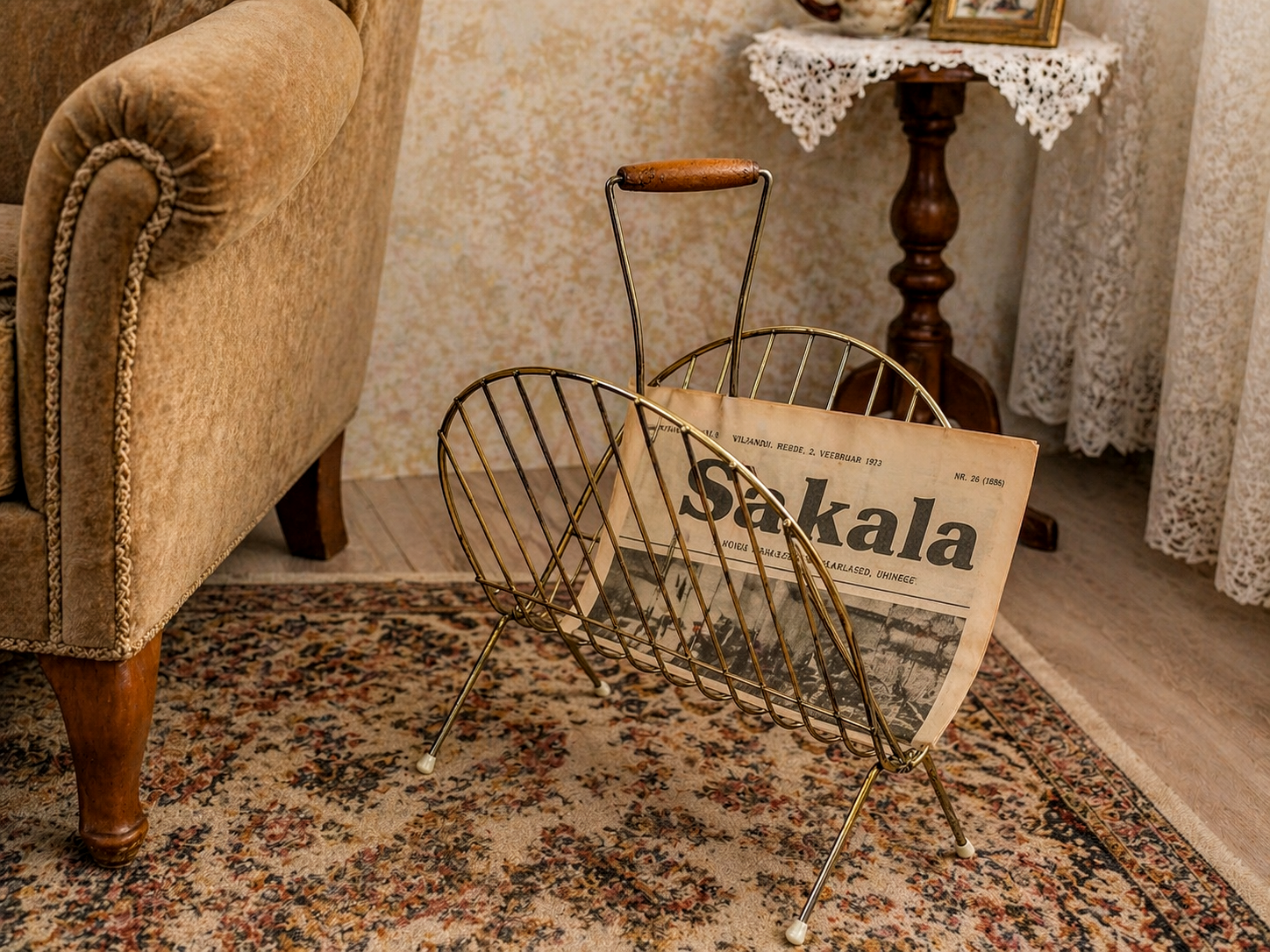 Ajatu vintage ajalehehoidja valmistatud messingist, mille peen joonemäng toob esile ajastu, kus vorm ja funktsioon olid tasakaalus. Aja jooksul omandatud kerge paatina lisab sügavust ja iseloomu, mitte ei varja, vaid jutustab oma lugu minevikust.