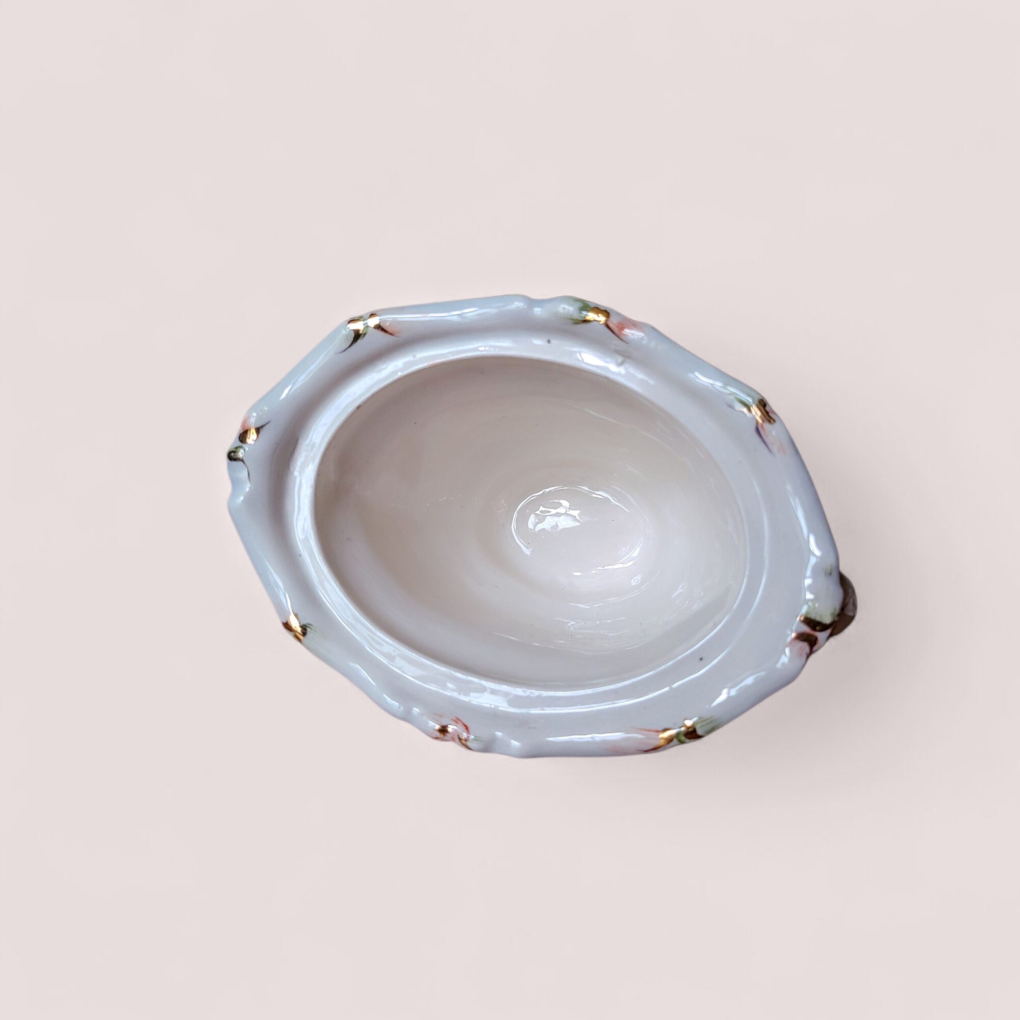 50 ndate aastate Itaalia bombonier-toos on kui väike armastuslugu portselanis. Õrnade reljeefide vahel tantsivad käsimaalitud roosid, mille kuldne sära meenutab suveõhtu viimaseid päikesekiiri. Kaane tipus õitsev portselanlillede kimp lisab esemele unistavat elegantsi, justkui mälestus ajast, mil iga detail loodi südame ja ilu pärast.