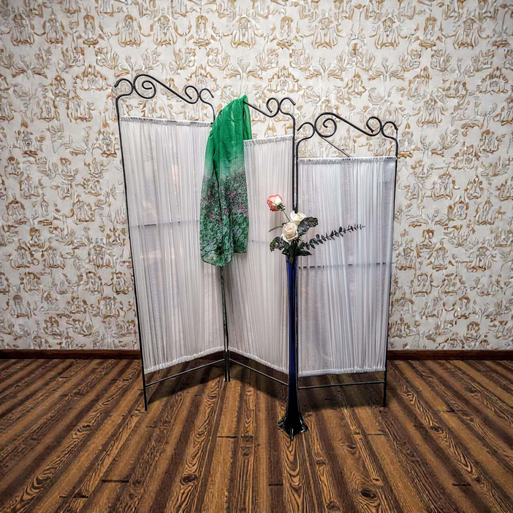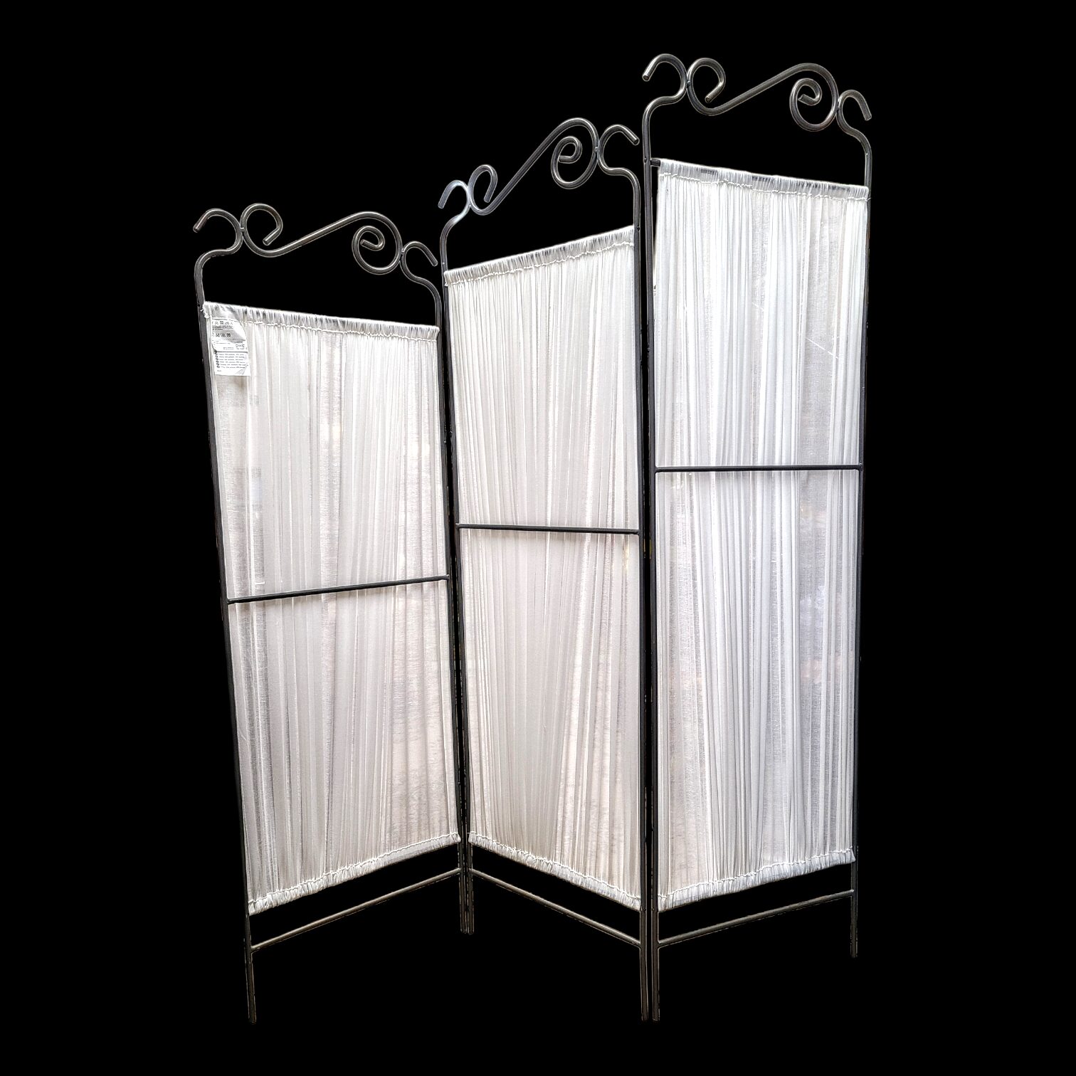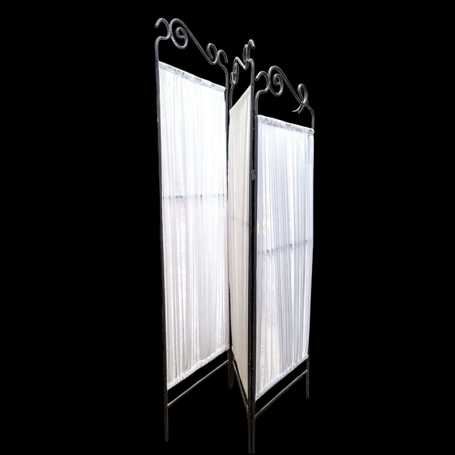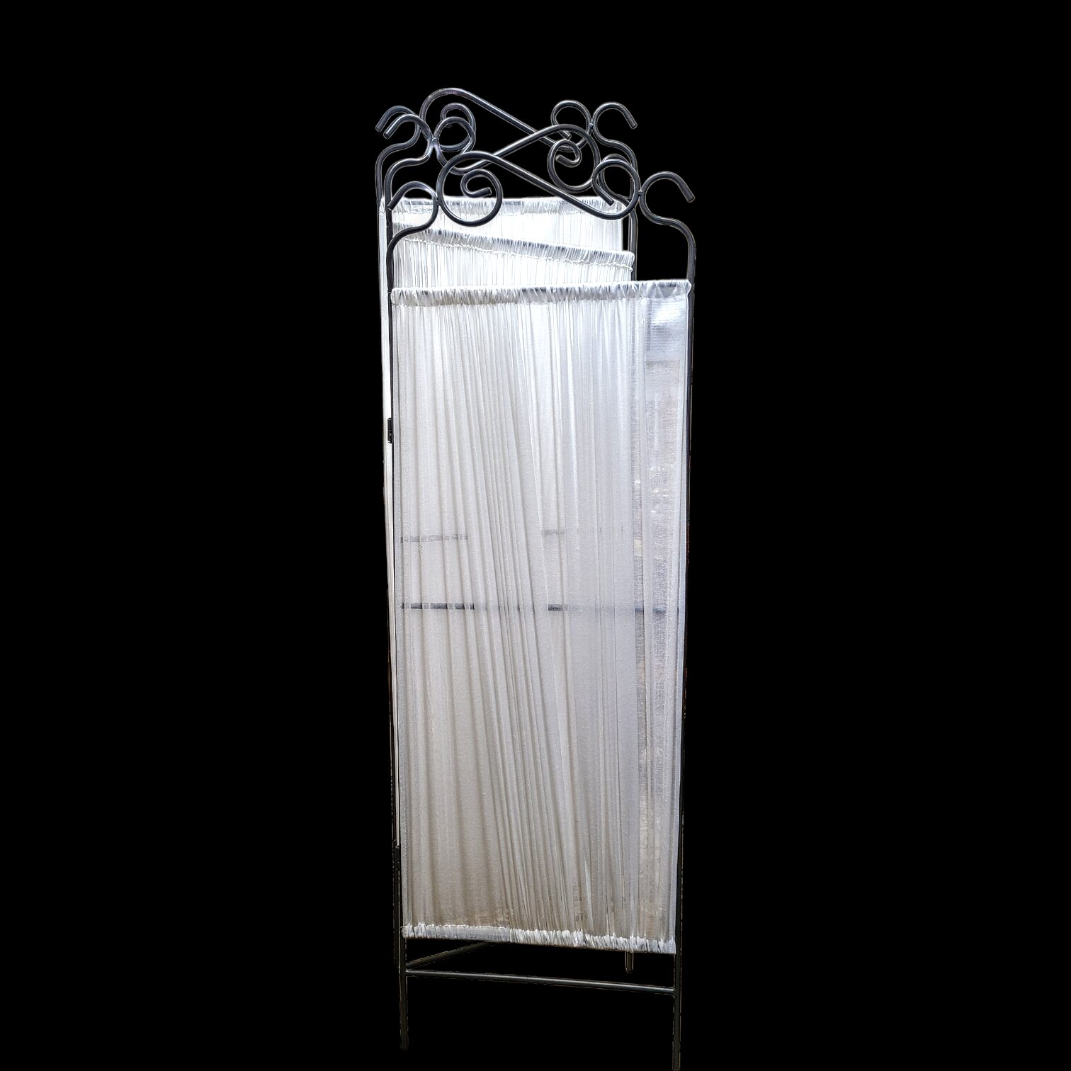 Saleda metallraami vahel langeb hele, poolläbipaistev kangas, mis ei sulge ruumi, vaid loob sellesse pehme piiri. EKNE sirm sobib ideaalselt magamisnurga, riietusala või rahuliku nurgakese loomiseks.