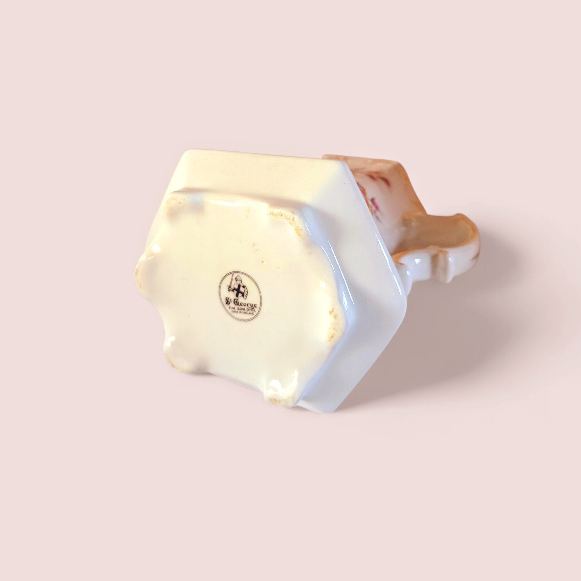 Kaunis St. George’s Works Longton peenportselanist kann on kui killuke inglise roosiaeda, kus hommikune päikesekiir puudutab õrnalt kastemärgi kroonlehti. Kannu pehmelt kumav glasuur ja kuldsed servad jutustavad lugusid aegadest, mil tee serveeriti pitsist laudlinale ja iga hetk kandis endas väärikat rahu.