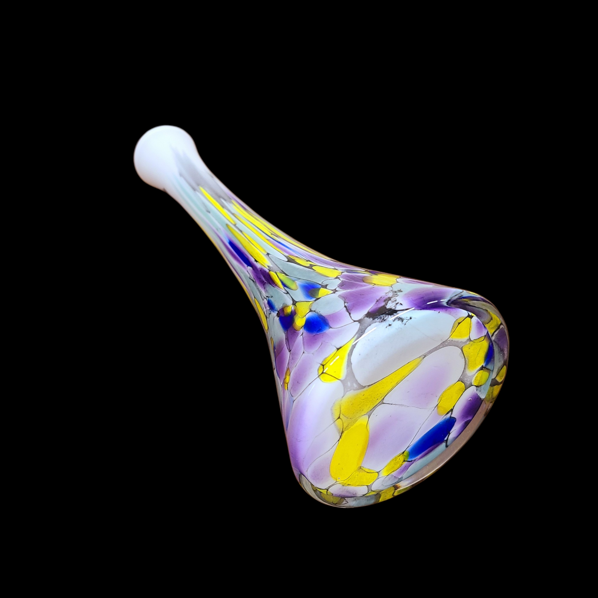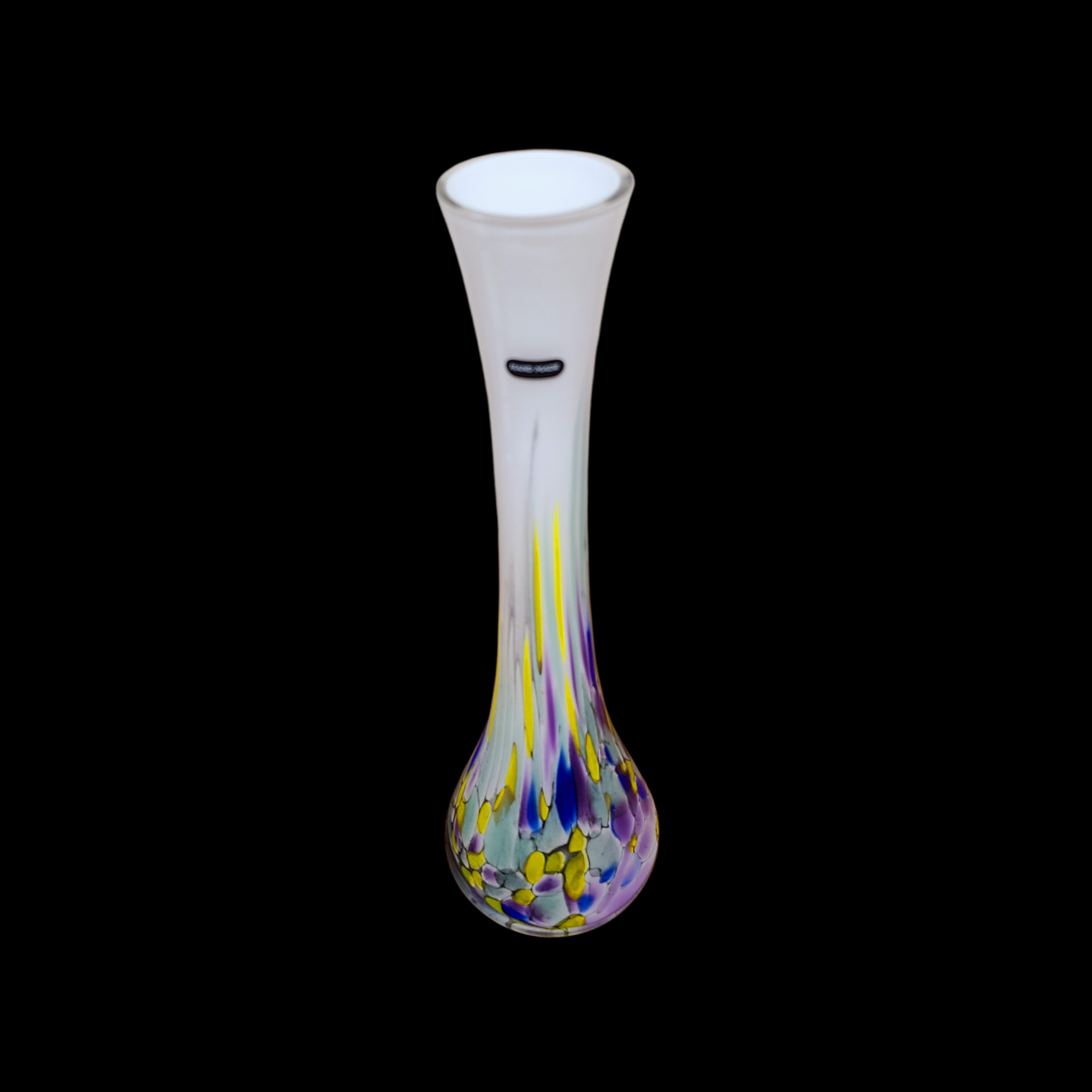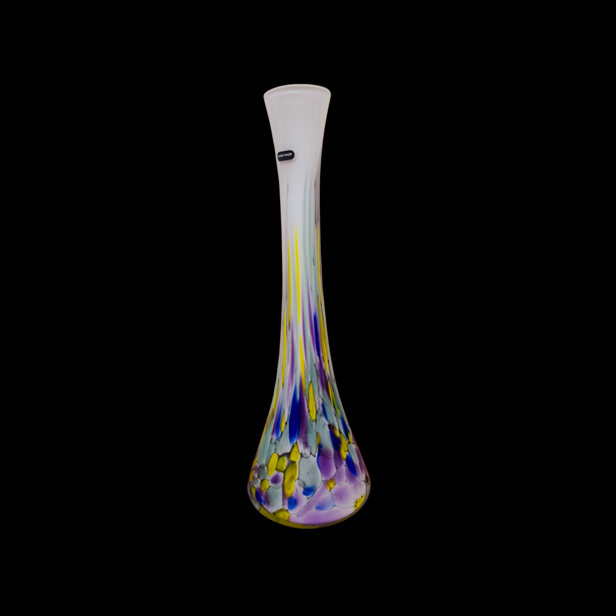 Pikk ja õrnalt avanev kael tõuseb nagu palve taeva poole, kandes endas elegantsi ja rahu. Alumises osas sulavad värvid – sirelililla, sügavsinine, päikesekollane ja õrn roheline – justkui õitsva aasa peegeldus klaasi sees. Kaunid värvilaigud on voolanud ja tardunud omaenda rütmis.