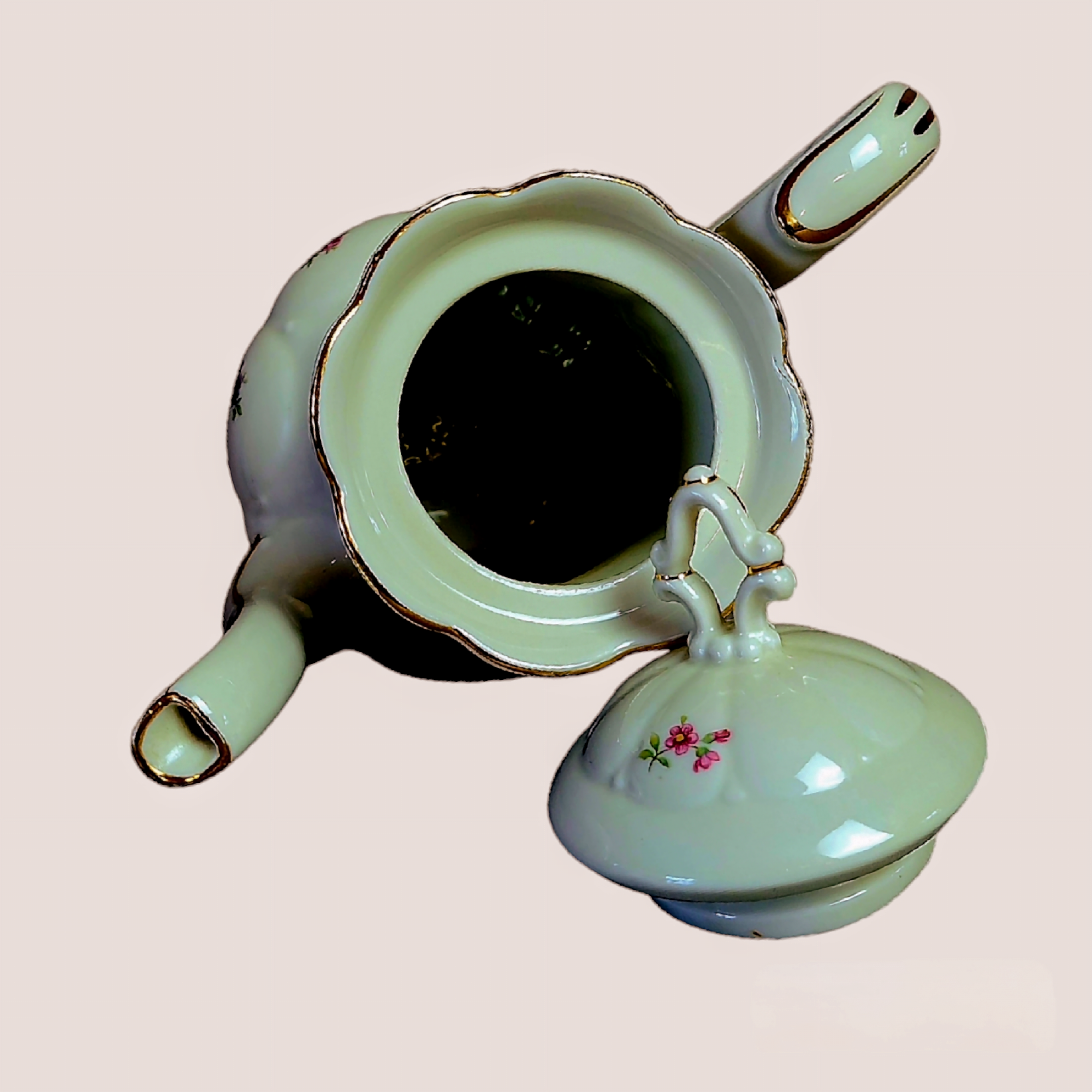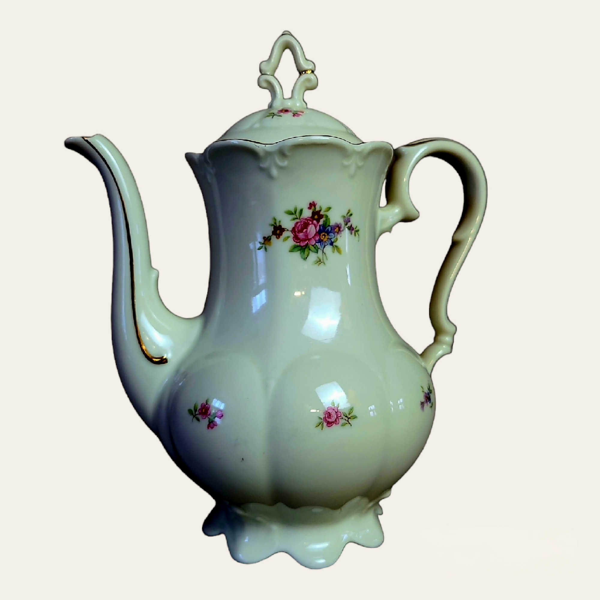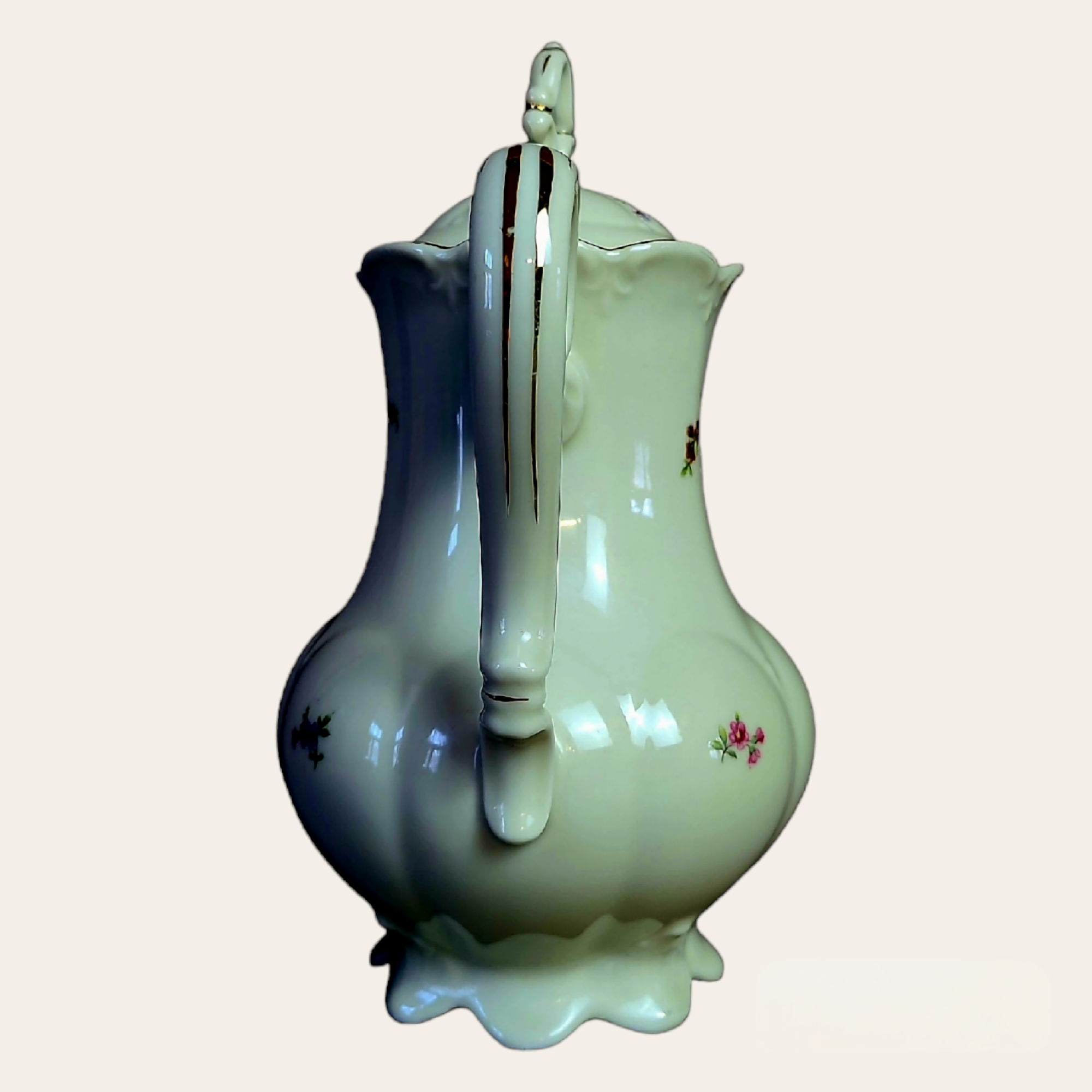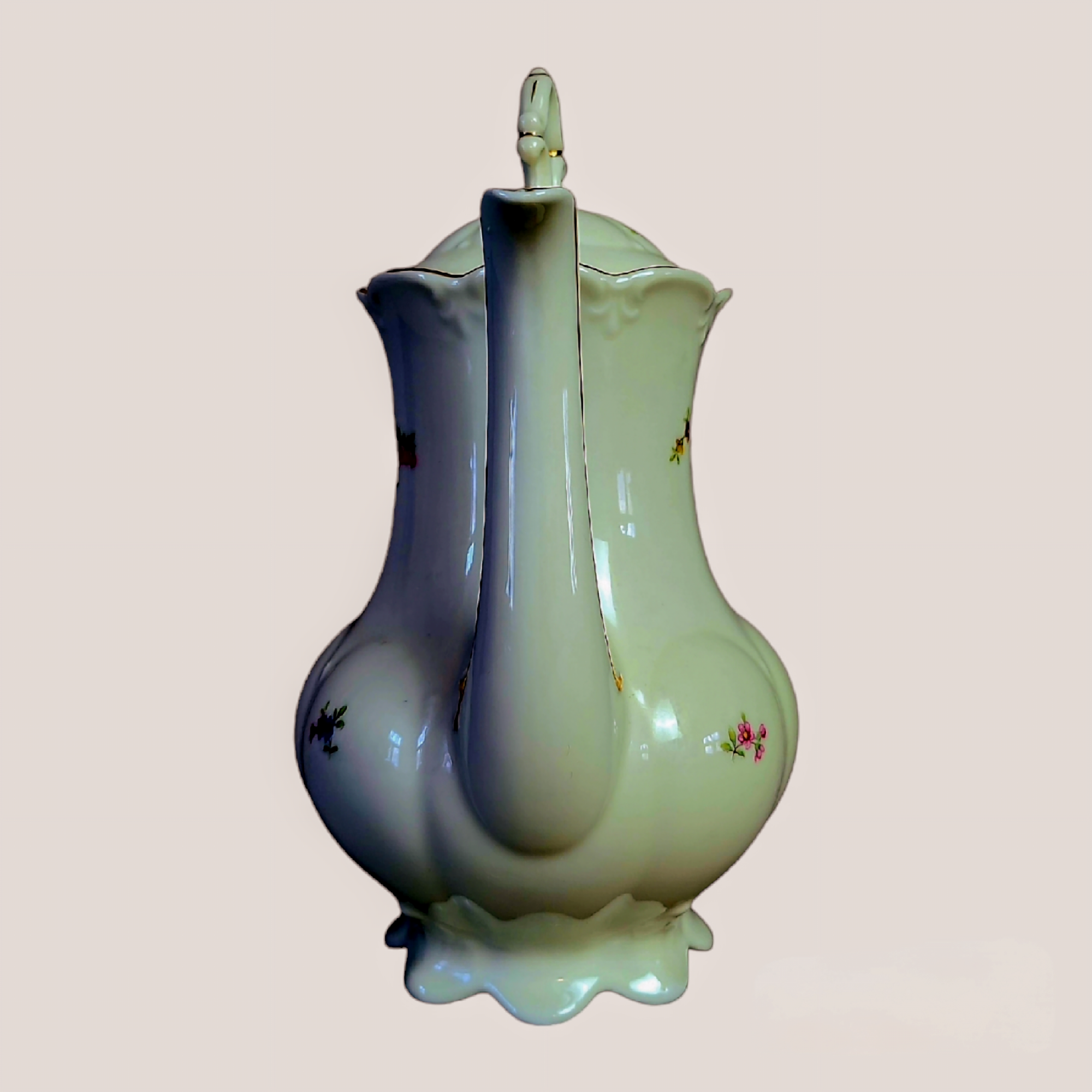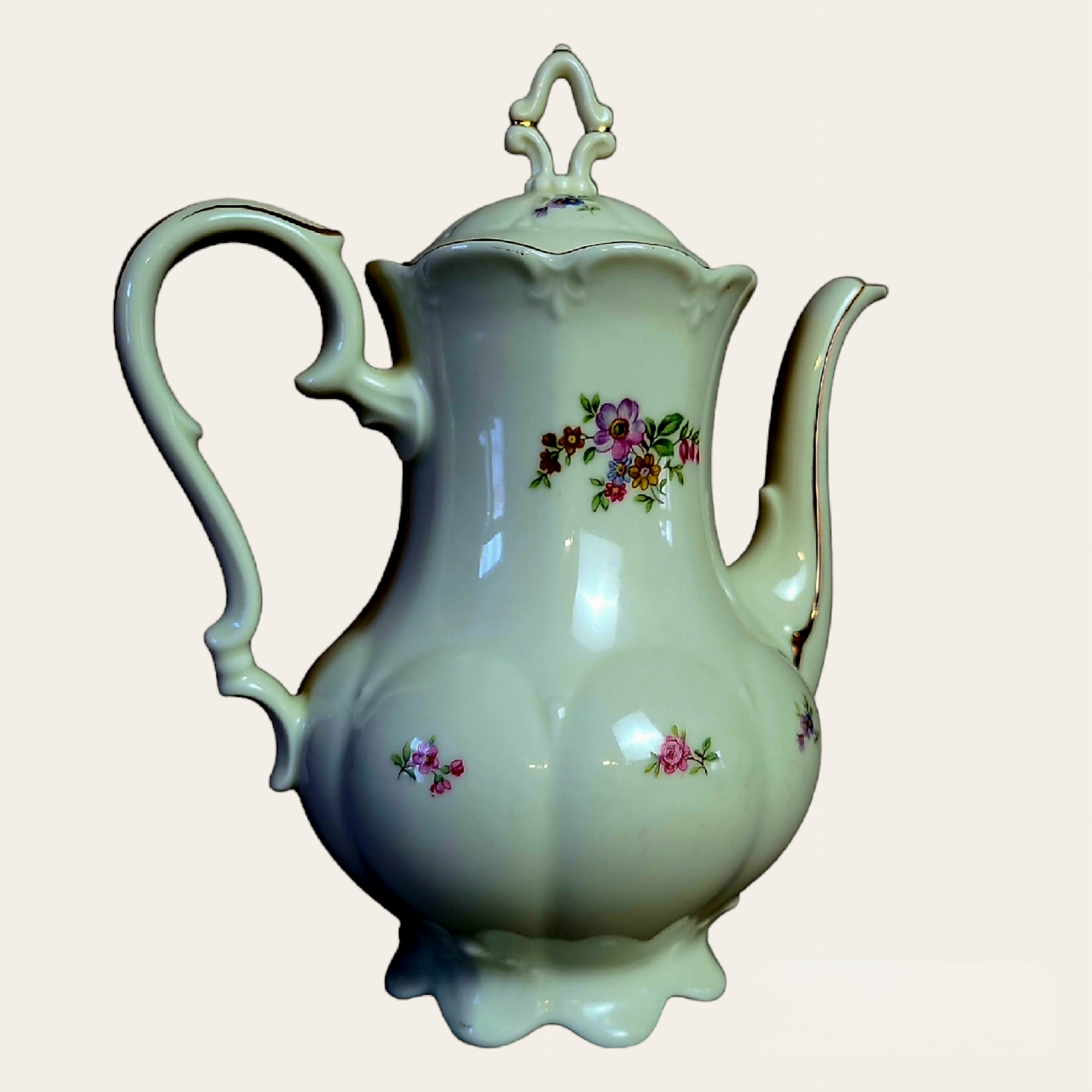 Rokokoo stiilis portselanist kohvikann, kaunid vormid, tagasihoidlik lille ja kulla dekoor. Õrnad reljeefid täiuslikud proportsioonid loovad unikaalse ilu, mis annab teie kohvihetkedele erilist hõngu.