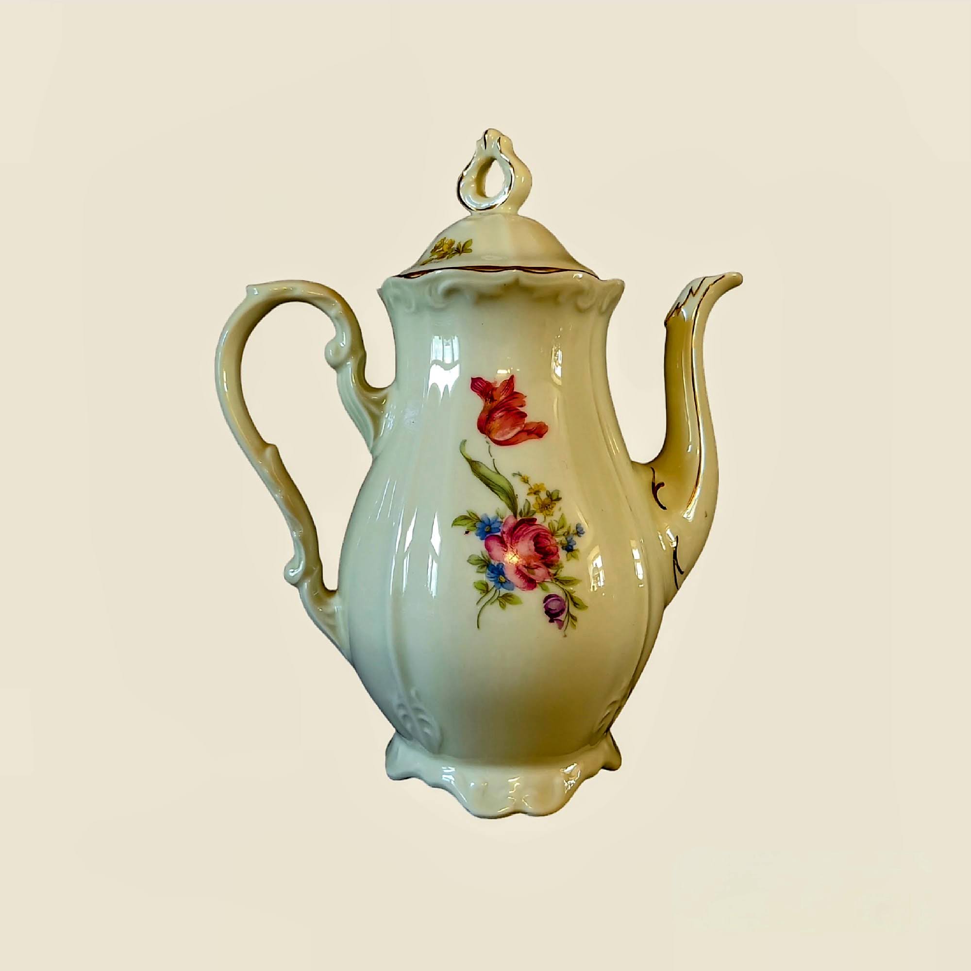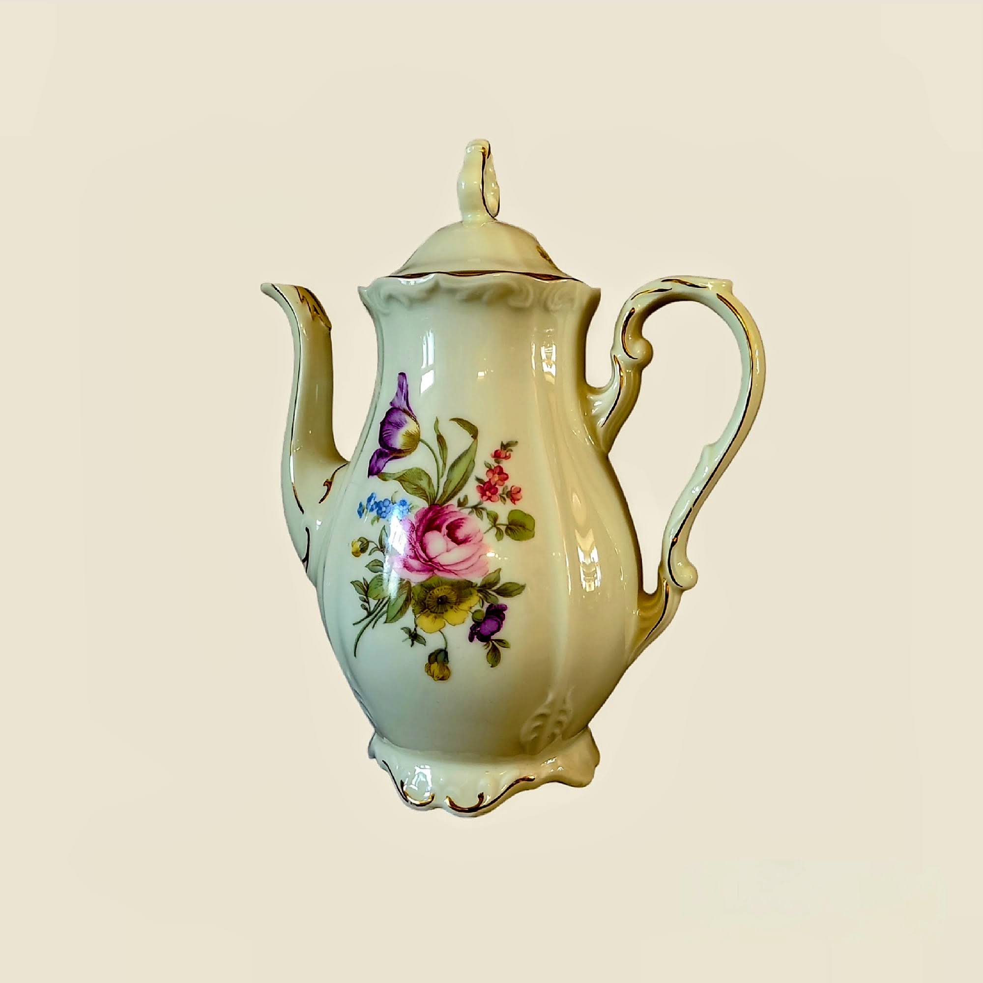 Ajatu ilu võrratu elevandiluu tooni kohvikannuga, kaunistatud armastatud Meisseni kimbu dekooriga sära lisavad kaunid reljeefid kuldse ääristusega. Pilkupüüdev kohvikann lisab lauale võluva elegantsi