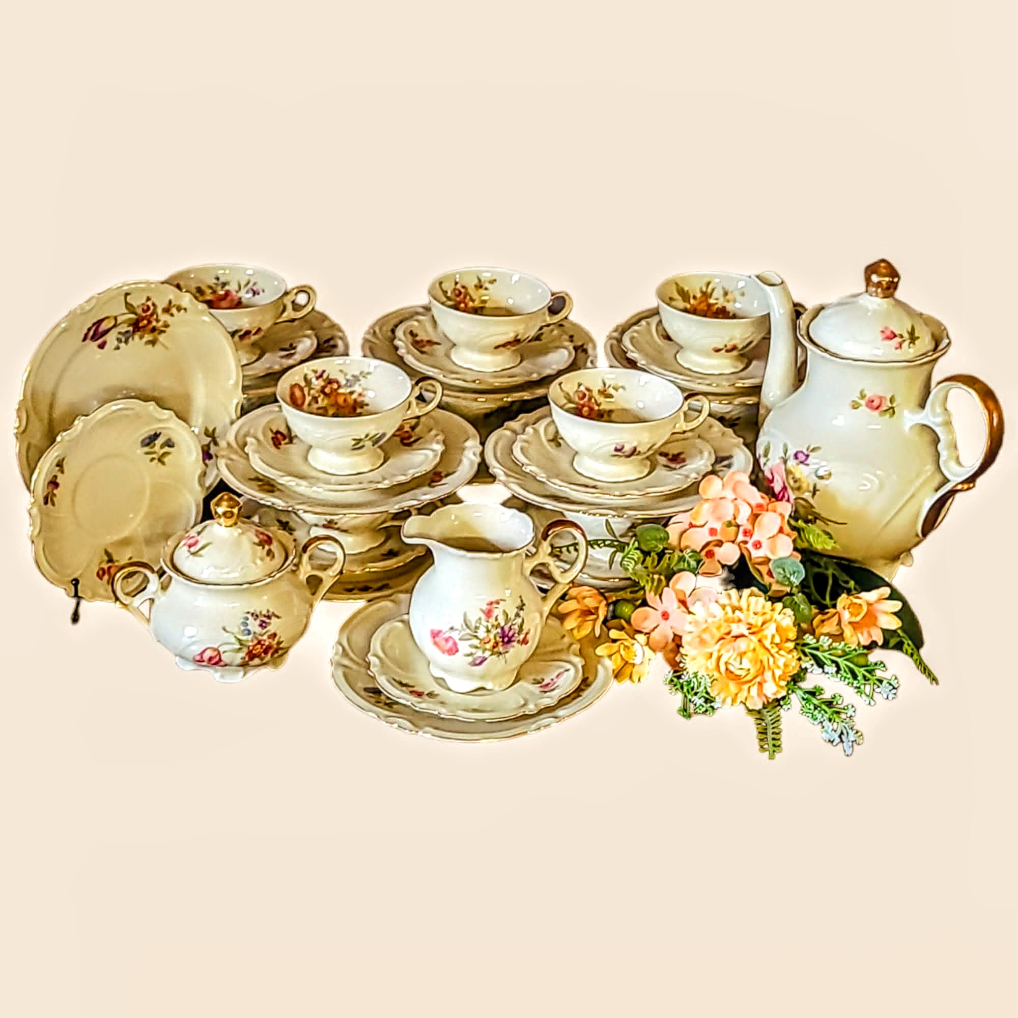 Kaunis elevandiluu tooni portselanist kohviserviisi Bavaria “Schwartsenhammer”. Elegantne serviis on kaunistatud võluva meisseni kimbu dekooriga, mis lisab igale kohvipausile ajaloohõngu. Kaunid selged reljeefid ja kuldsed aktsendid annavad serviisile ajatu võlu.