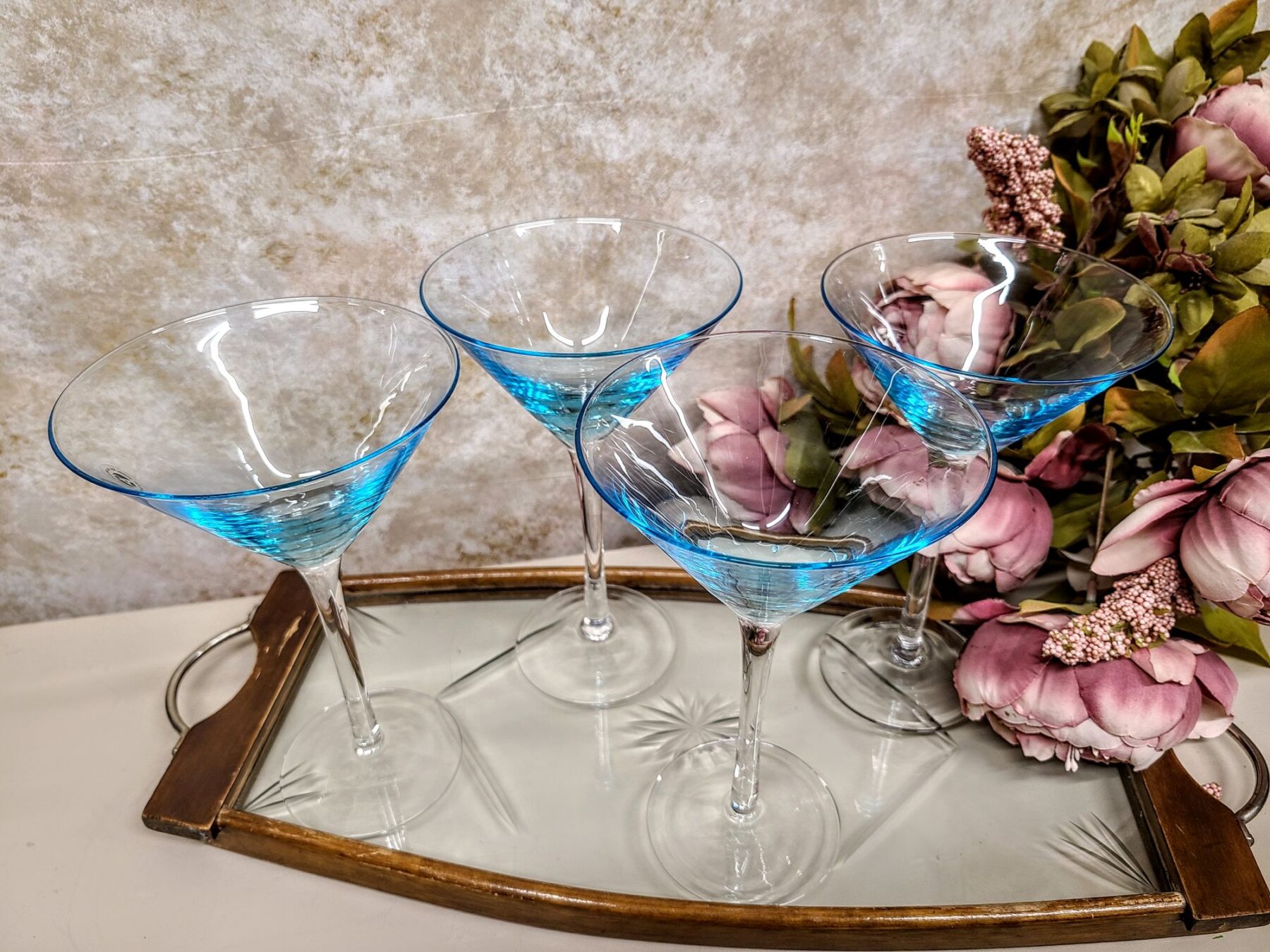 Skandinaavia suuga puhutud ( Munblåst ) kunstklaasist kokteili ja martini pokaalid. Õrn türkiissinine toon loob valguses pehme helgi. Kaunis pokaal on käsitöö, täis põhjamaist minimalismi ja õhulist elegantsi.