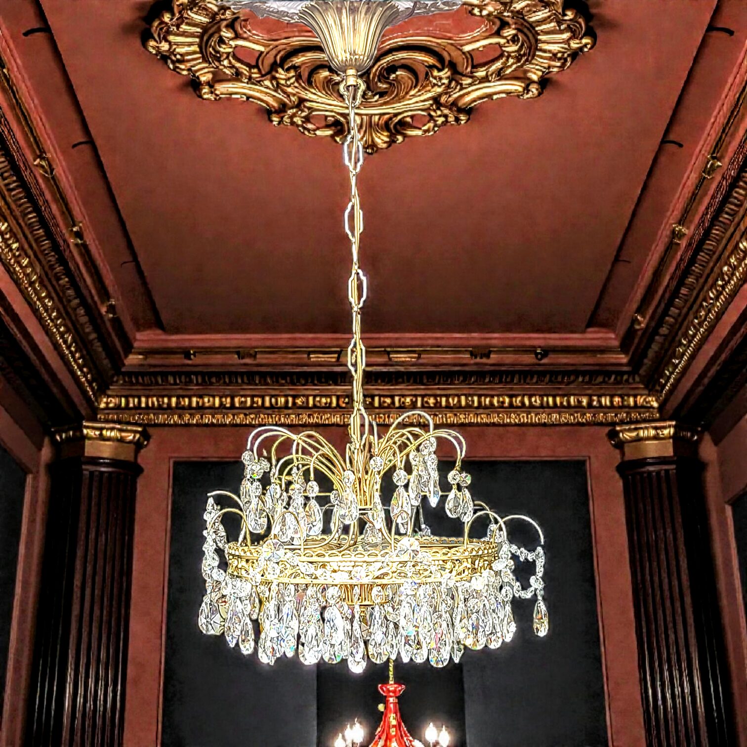 Kuldse tooniga metallraam kaardub õrnalt nagu õitsev taim, kandes endal rikkalikult rippuvaid kristalle, mis helgivad nii päevavalguses kui ka süüdatud tulede kumas. Iga kristallripats jutustab oma vaikset lugu – õhtusöökidest, muusikast ja hetkest, mil tuba täitus naeru ja valgusega.