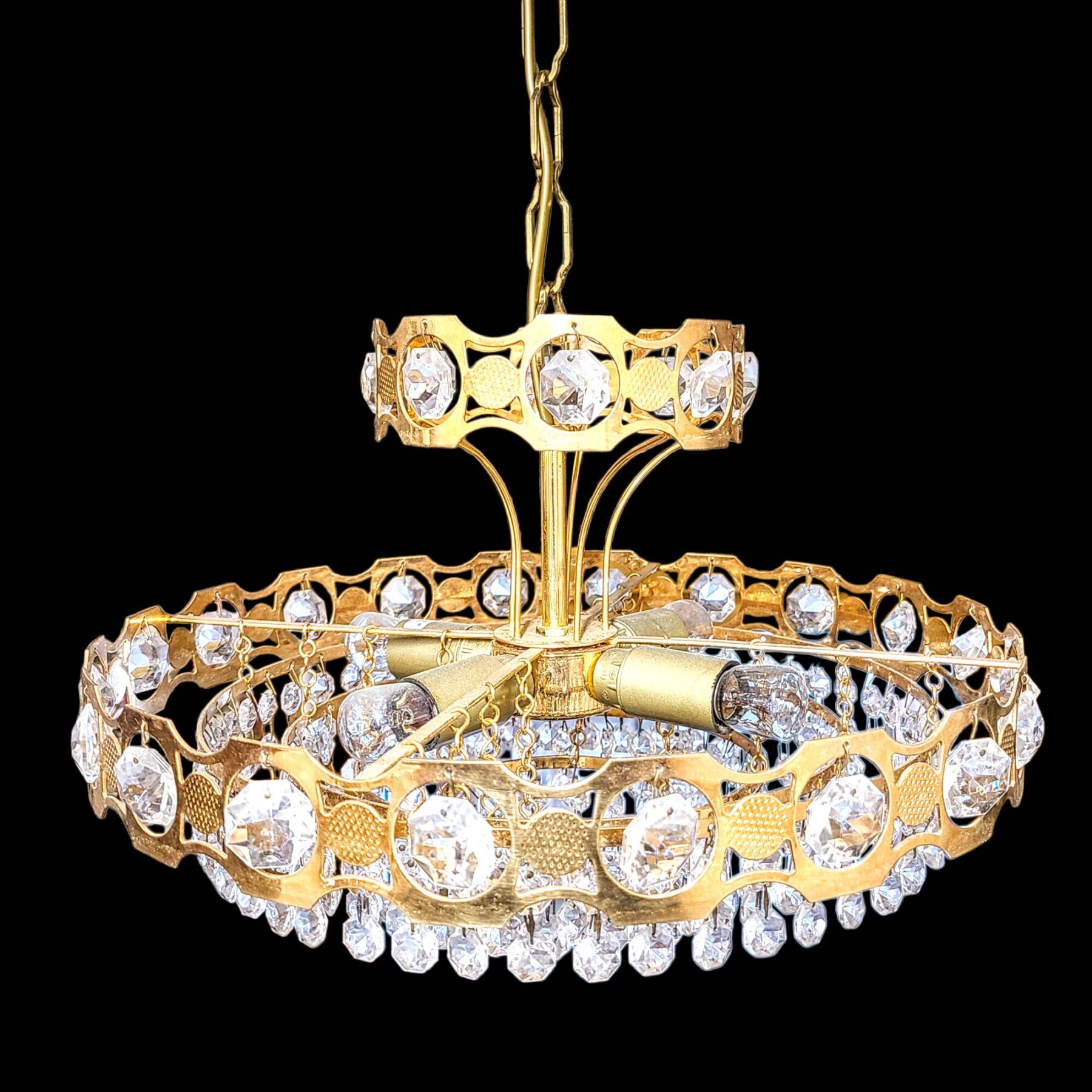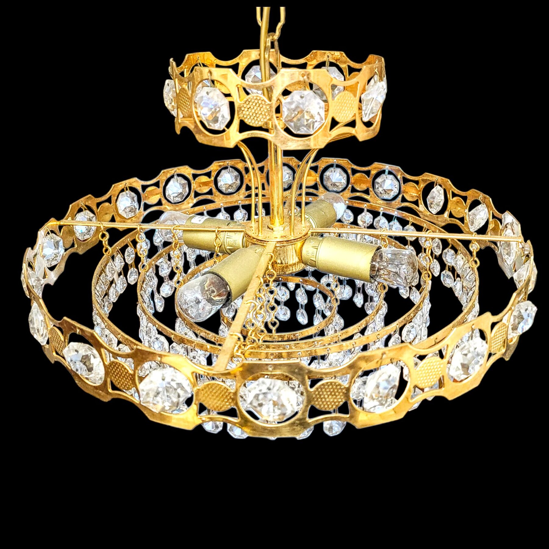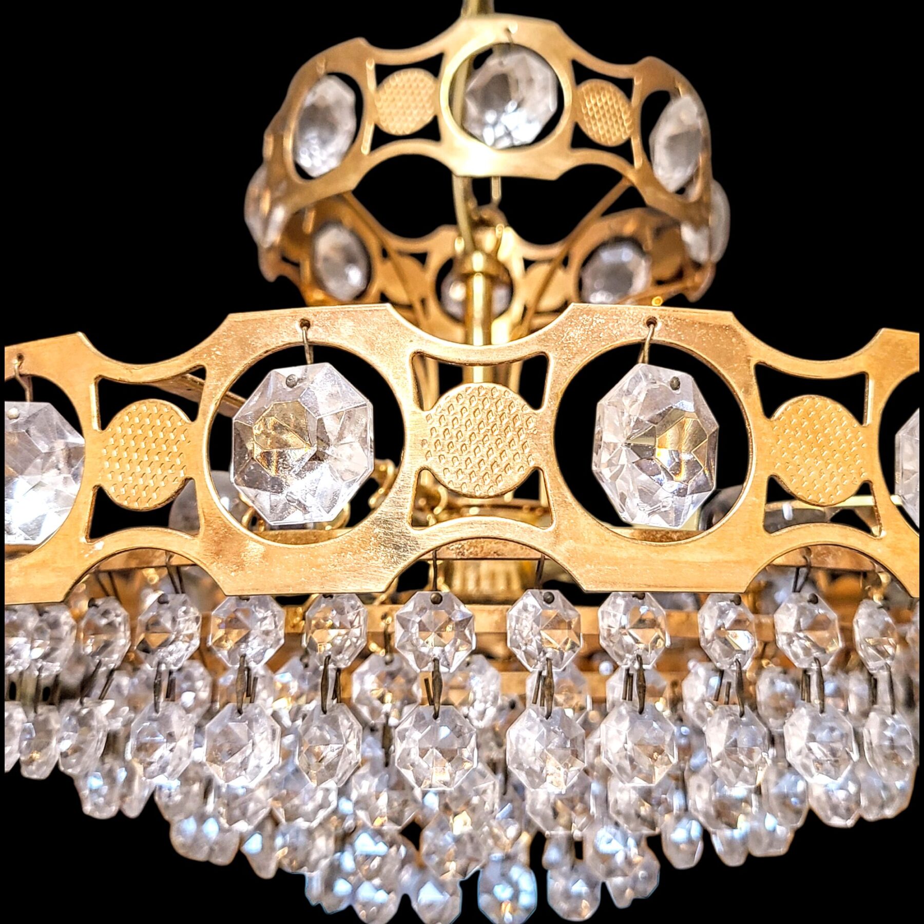 Säravad kristallripatsid püüavad iga valguskiire, murdes selle pehmeks sädeluseks. Kõik ripatsid on terved ja heas seisukorras, kandes endas aastakümnete vaikset väärikust. Messingist osadel leiduvad õrnad kulumisjäljed jutustavad oma lugu ajast ja kasutusest.