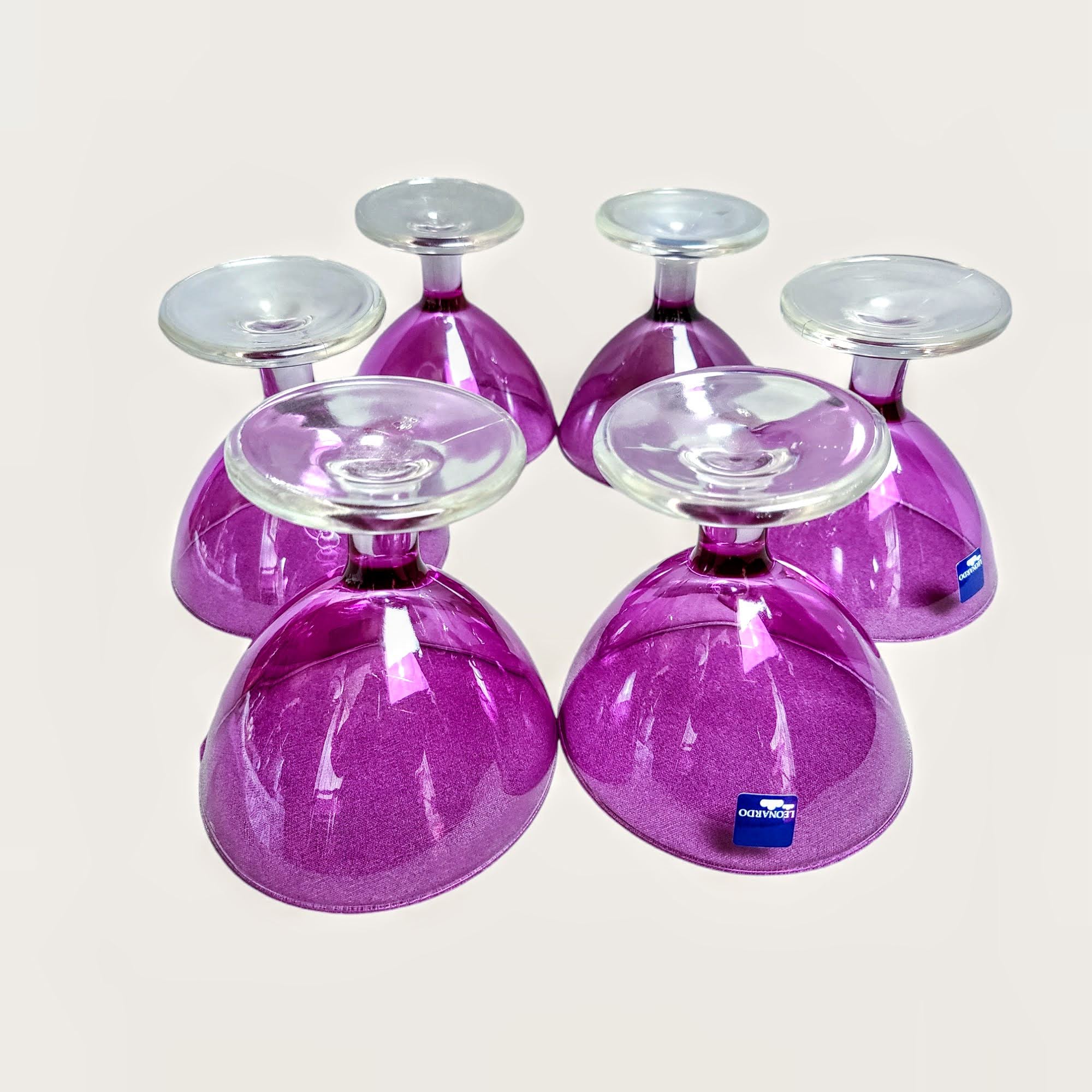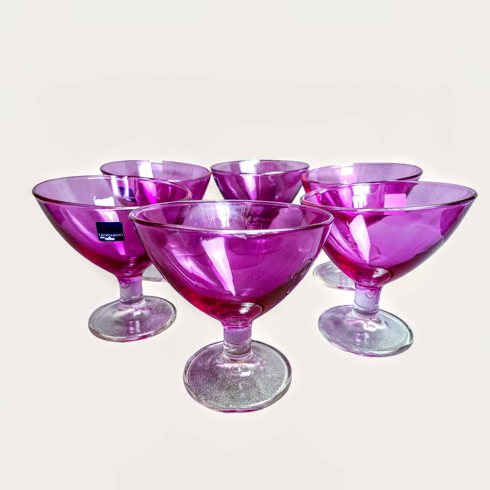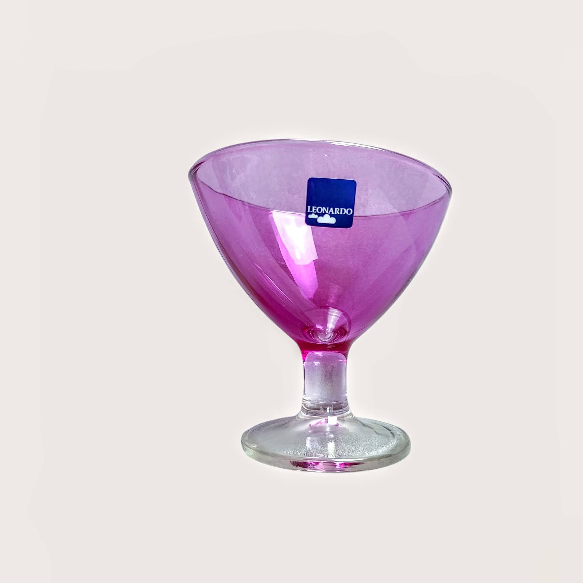 Uhked 1980. aastatest pärit Leonardo magustoidu pokaalid Saksamaalt on tõelised pilgupüüdjad, peegeldades möödunud ajastu stiili. Pokaalid on valmistatud erilise meistritööna, ühendades endas kaasaegse disaini ja klassikalist ilumeelt. Õrn lillakas-roosa toon, mis sujuvalt jätkub selge läbipaistva klaasina pokaali jalal, loob võluva efekti. Kaunis pokaal peegeldab valgust pehmelt, justkui tantsiskledes erinevate varjundite vahel.