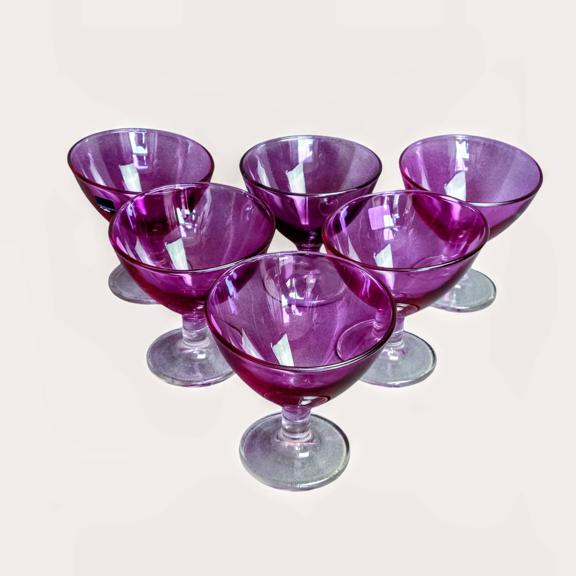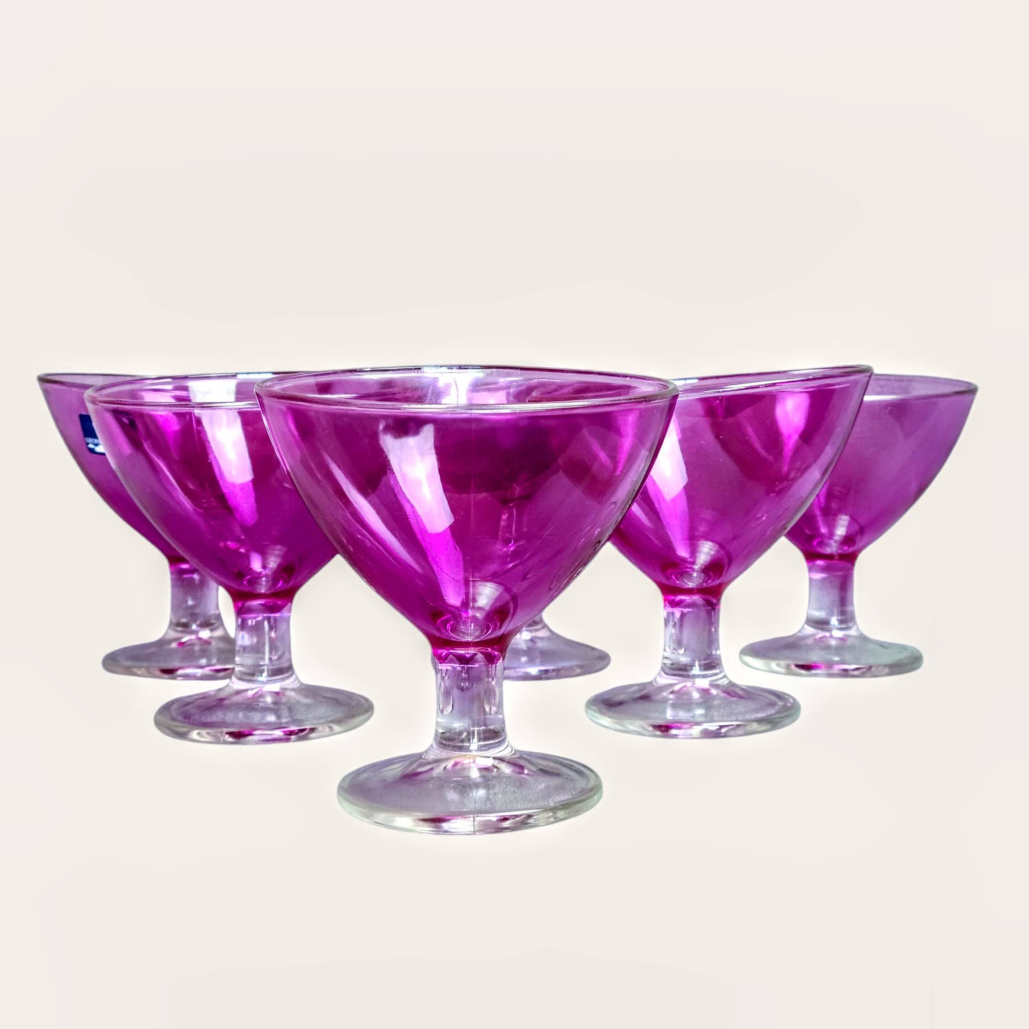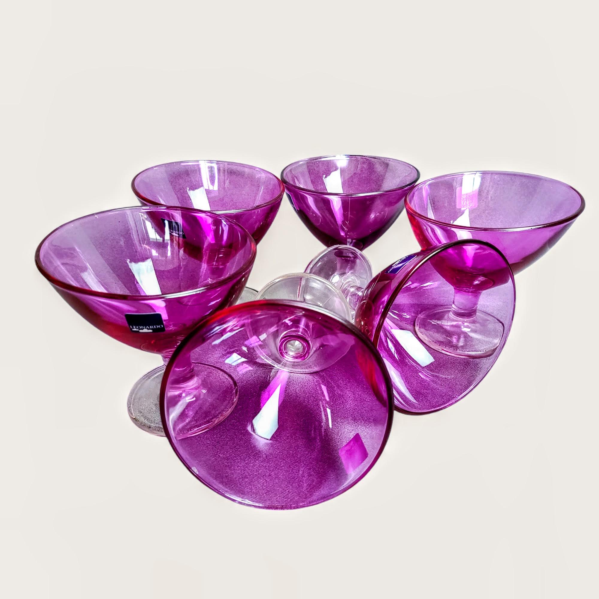 Uhked 1980. aastatest pärit Leonardo magustoidu pokaalid Saksamaalt on tõelised pilgupüüdjad, peegeldades möödunud ajastu stiili. Pokaalid on valmistatud erilise meistritööna, ühendades endas kaasaegse disaini ja klassikalist ilumeelt. Õrn lillakas-roosa toon, mis sujuvalt jätkub selge läbipaistva klaasina pokaali jalal, loob võluva efekti. Kaunis pokaal peegeldab valgust pehmelt, justkui tantsiskledes erinevate varjundite vahel.