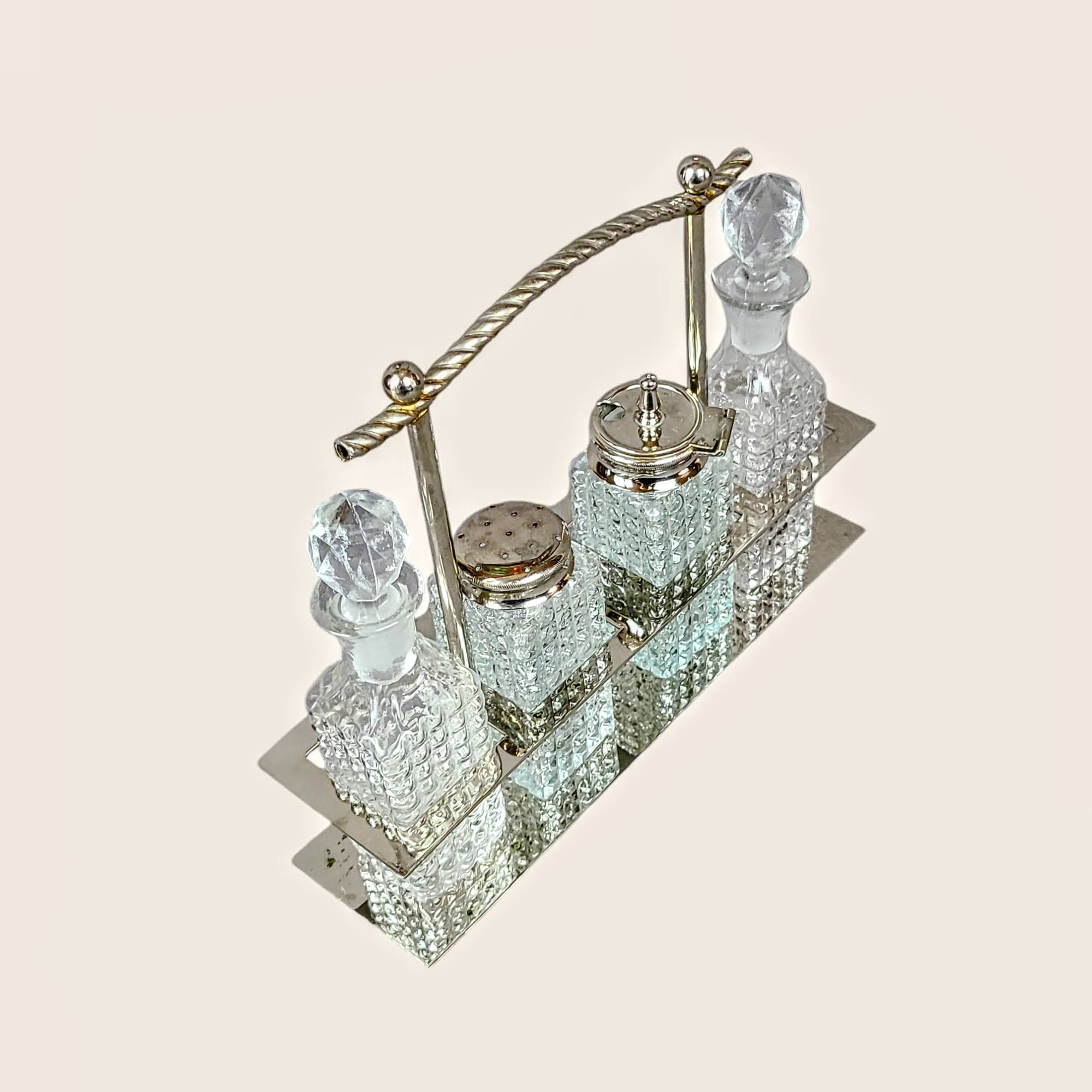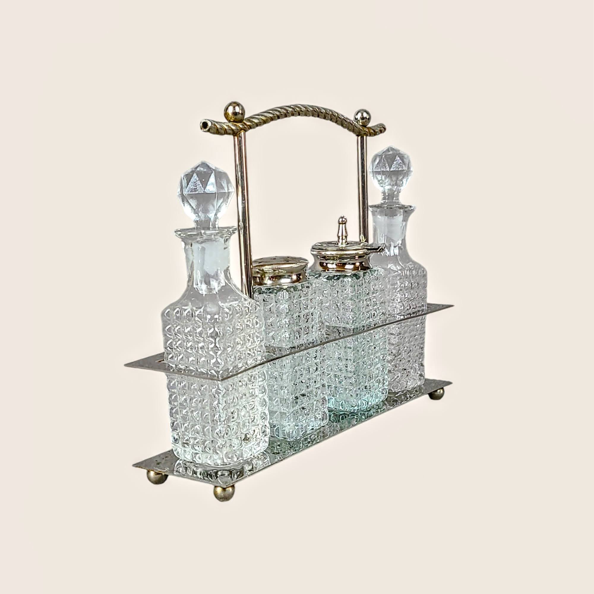 Metallist raam, millele tekkinud minimaalsed paatina jäljed, lisab esemele nostalgilist võlu. Hoidikus on neli klaaspudelit, millest kaks on mõeldud õli ja äädika jaoks ning kaks soola ja sinepi jaoks. Pudelid on väga heas seisukorras, olles ideaalsed praktiliseks kasutamiseks.