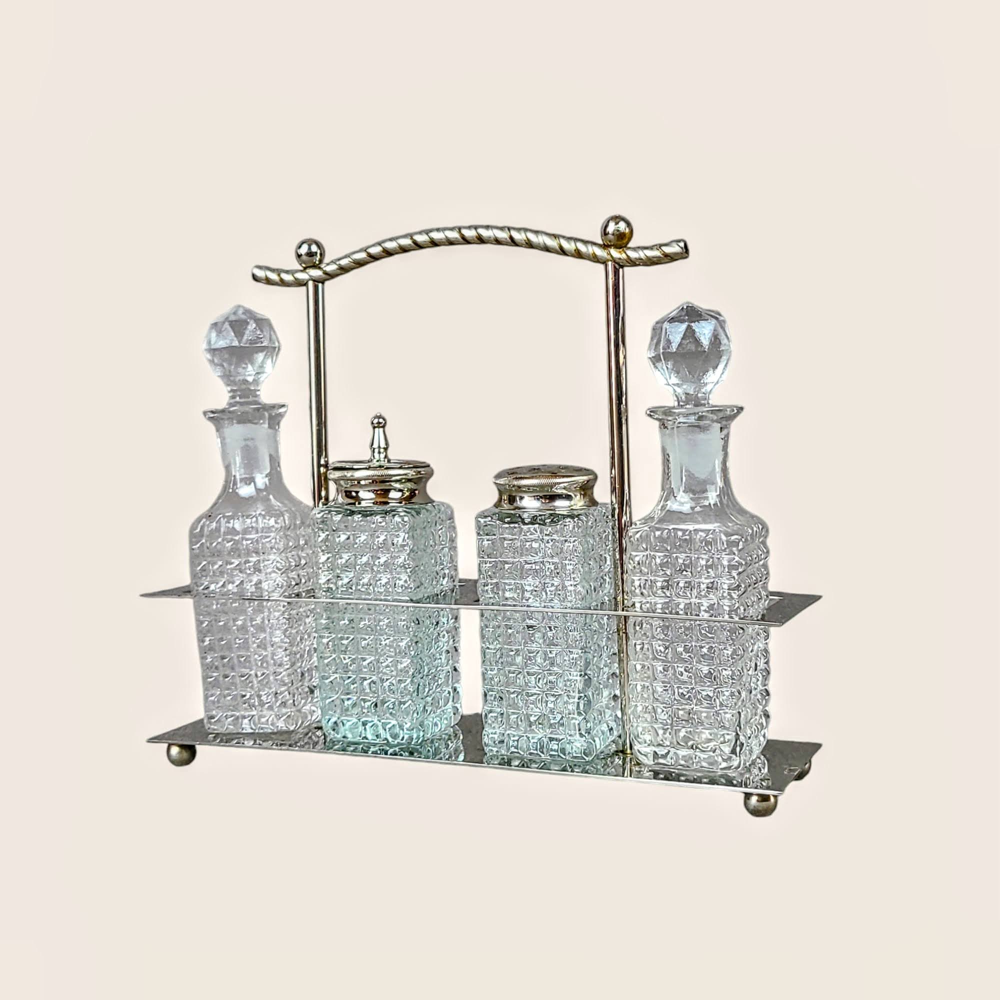Kaunis nelja pudeli/ purgiga maitseainete hoidik 1900. aastatest. Täiuslik kombinatsioon funktsionaalsusest ja esteetilisest ilust. Vintage hoidik on suurepärane täiendus igale söögilauale.