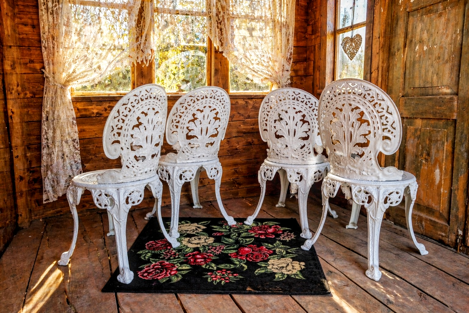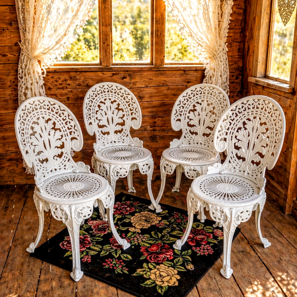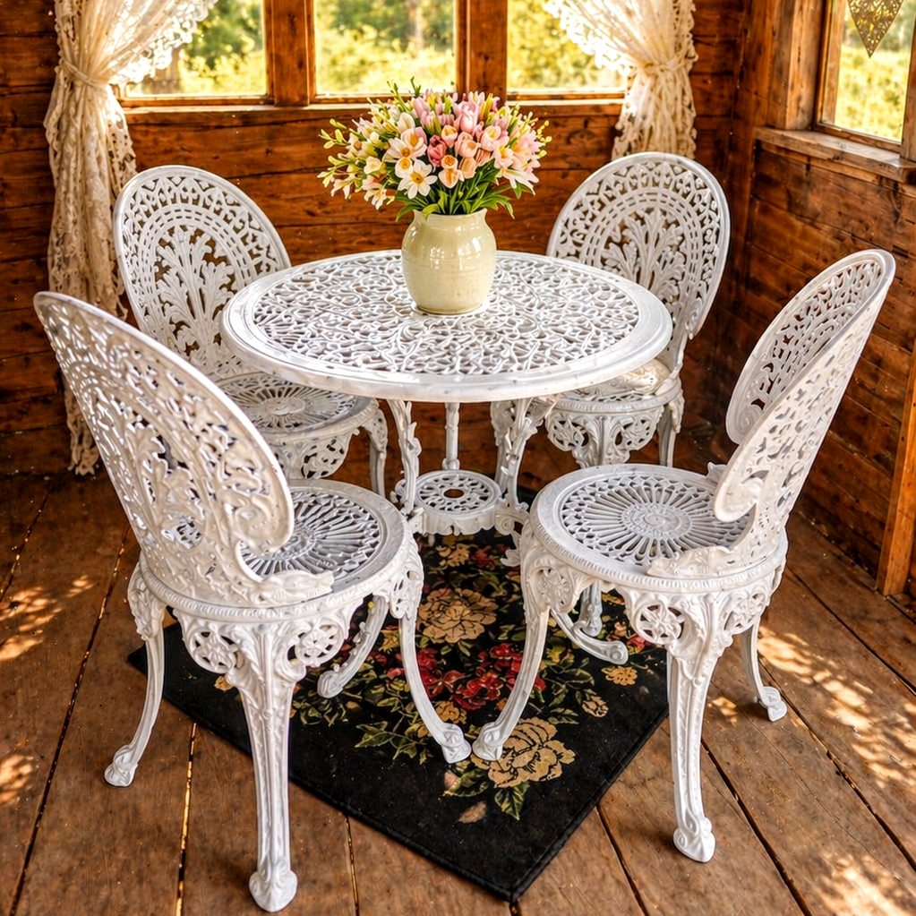 Laua ja nelja tooli detailirohke ornamentika, kaarduvad jooned ja uus valge viimistlus loovad ansambli, mis ei mõju pelgalt aiamööblina, vaid aia kujundava kohaloluna. Kaunis komplekt, mis ei küsi tähelepanu, vaid loob selle.