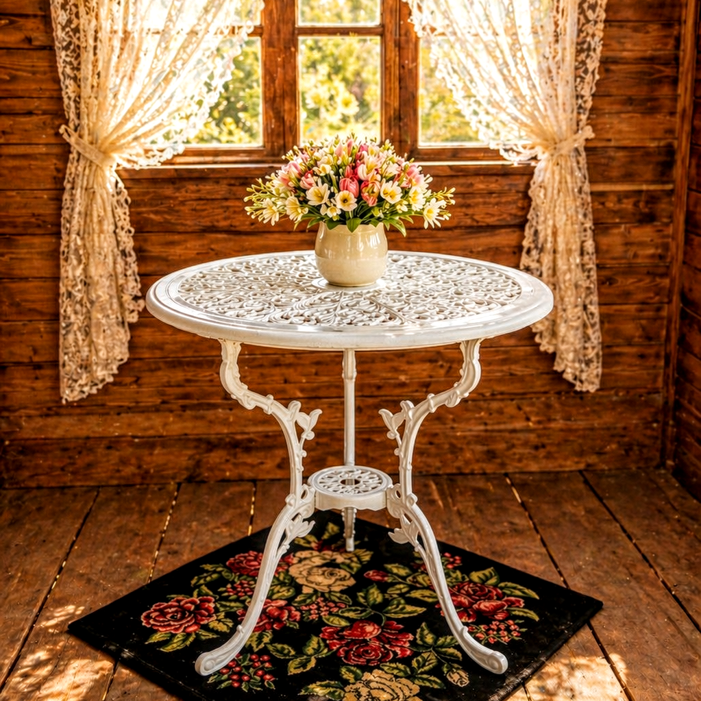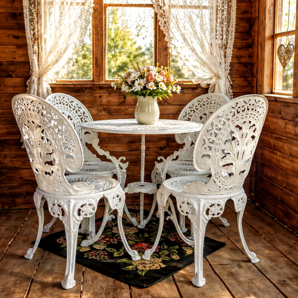 Victoria stiilis malmist aiamööbli komplekt kannab endas ajatut elegantsi, kus kohtuvad vormi peenus, materjali väärikus ja vana Euroopa aedade romantiline meeleolu.
