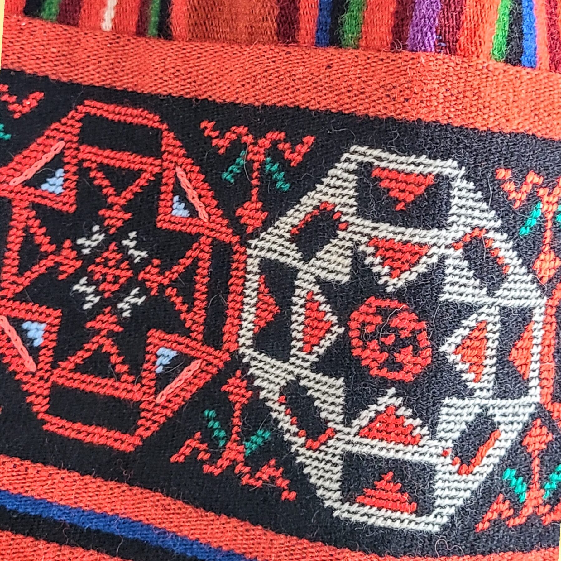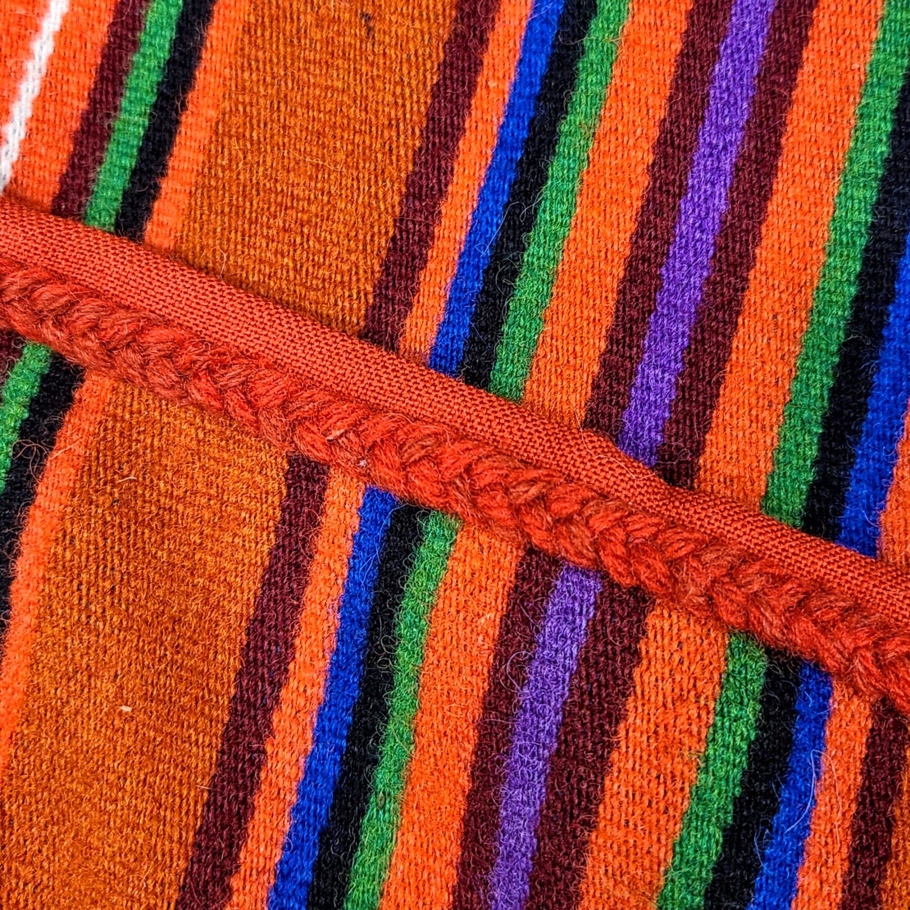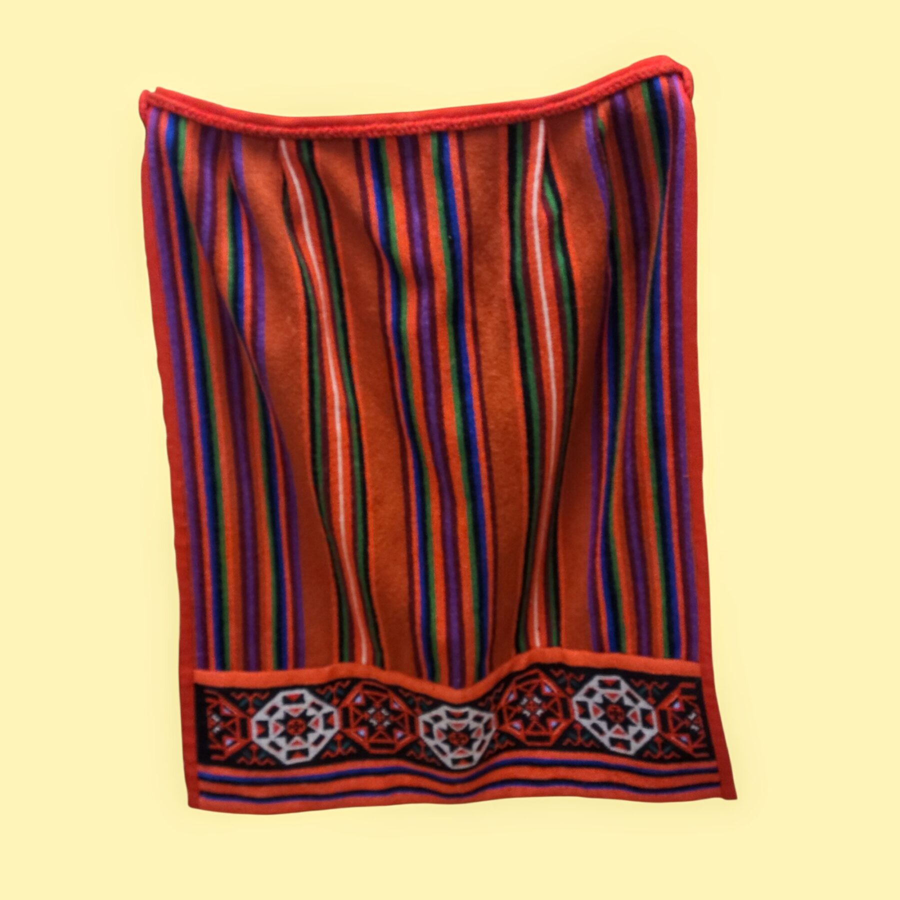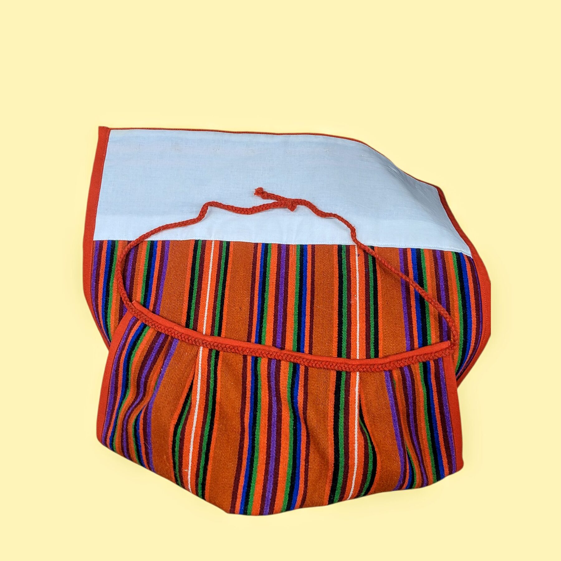 Muhu naise põll on kui soe mälestus saare suvest mis talletatud villasesse kangasse. Oranž põhi helgib vaikselt nagu loojang mere kohal, triibustik annab rütmi ja elujõudu, justkui sammud kirikuteel või pehme tuule hingus kadakate vahel. Põlle alumist osa eraldab ratastest ripatsite rida – vaikne jutustus ajast, mil iga märk ja kujund kandis tähendust.