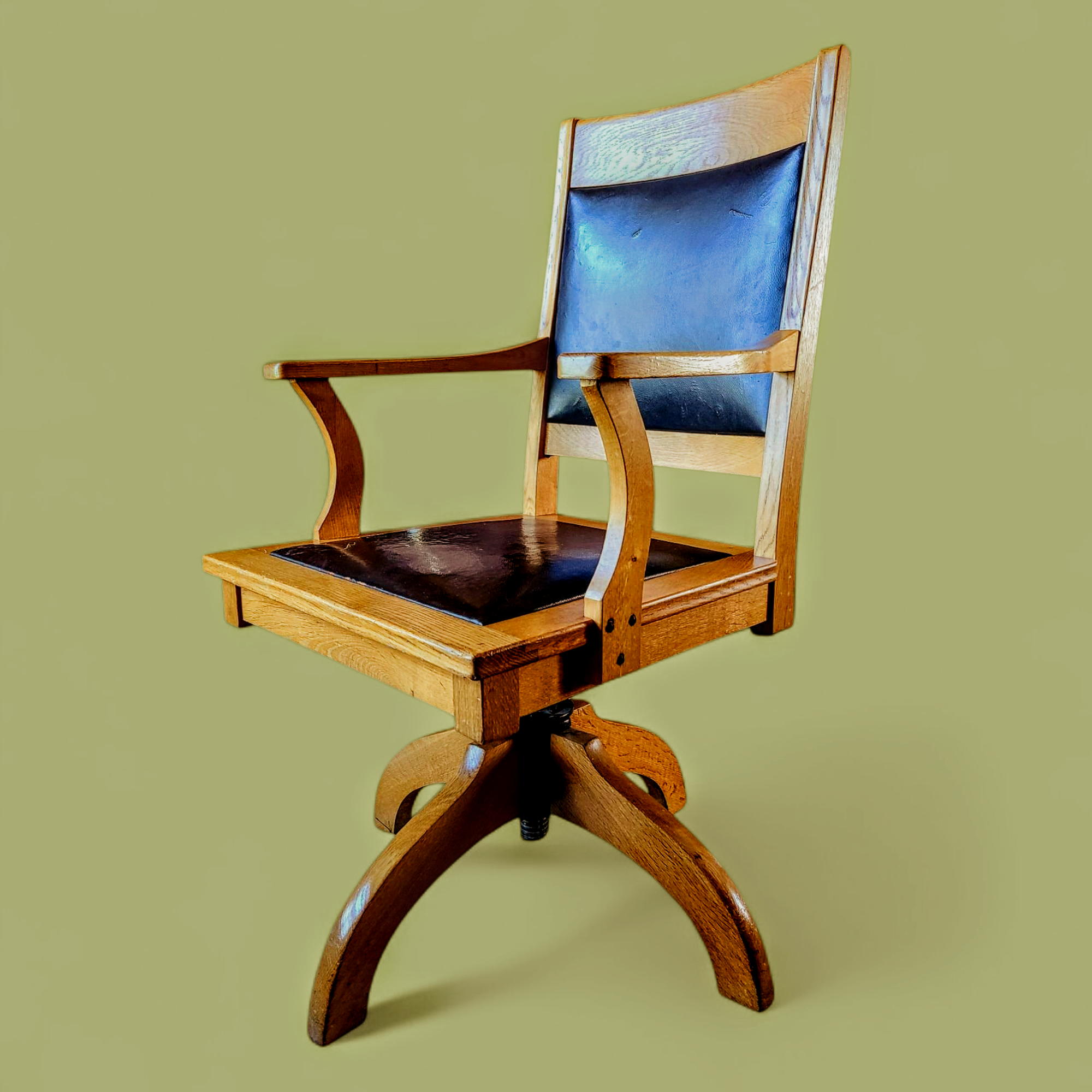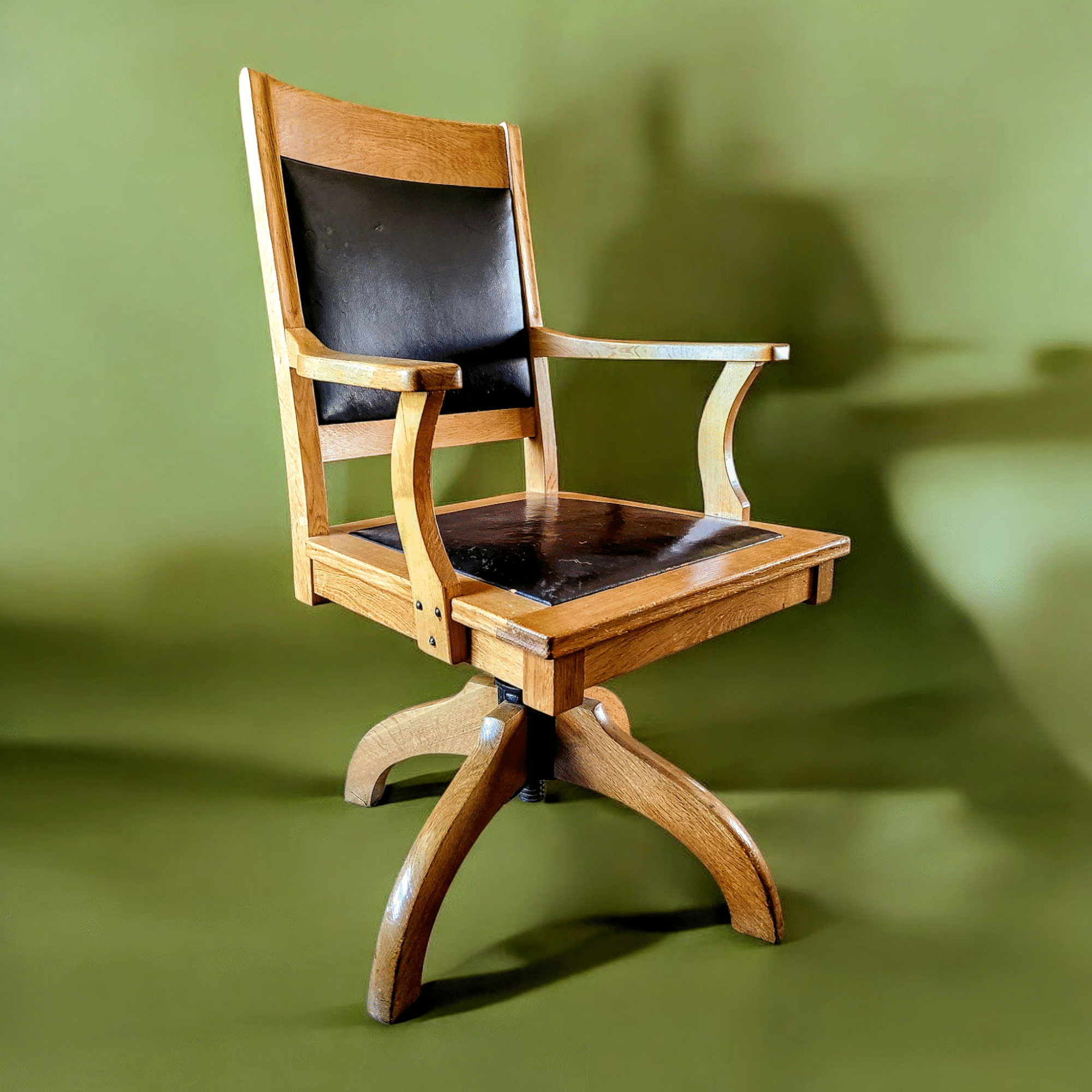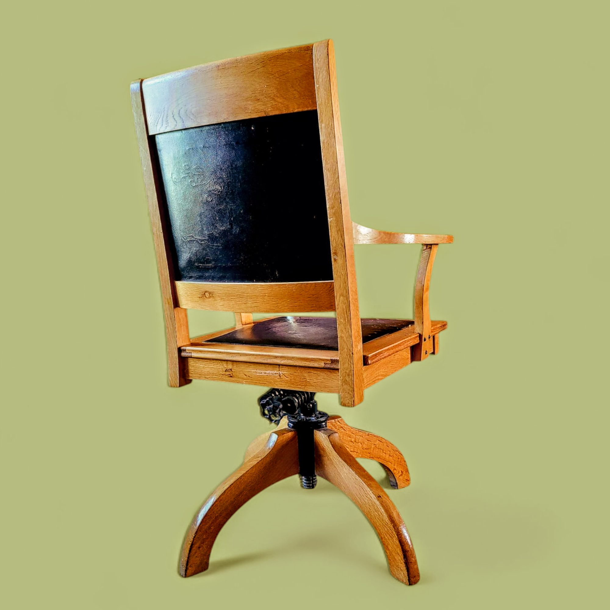 Astu ajas tagasi ja tunne möödunud sajandi väärikust kauni tammepuidust kontoritooliga. Tool mis kannab endas ajalugu, meisterlikkust ja ajatut disaini. 20. sajandi esimesest poolest pärit pöörlev tool on ehe näide ajast, mil mööbel loodi kestma – tugevast tammepuust raam, elegantne kumerustega käetugede disain ning klassikaline nahkkattega iste ja seljatugi loovad üheskoos unustamatu mulje.