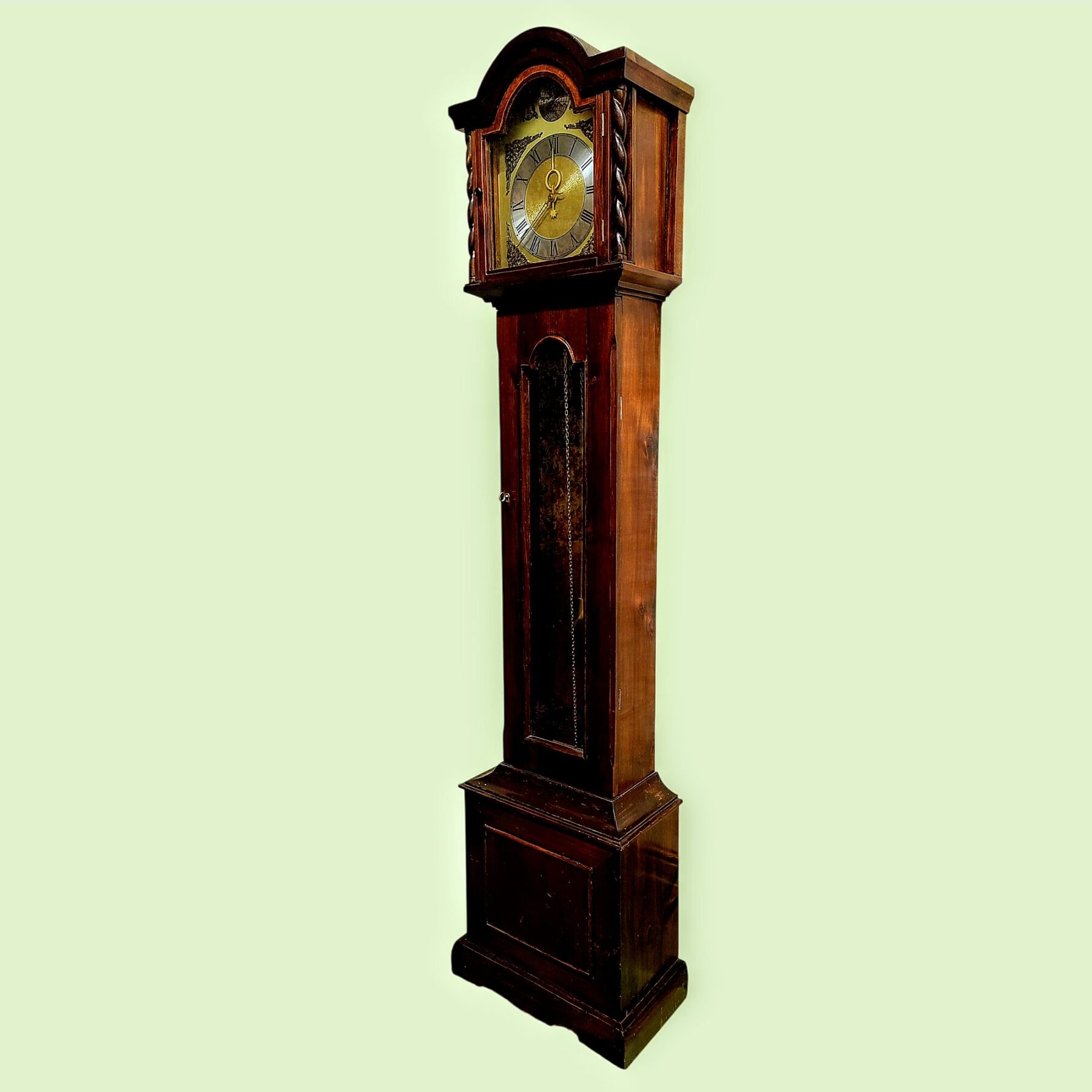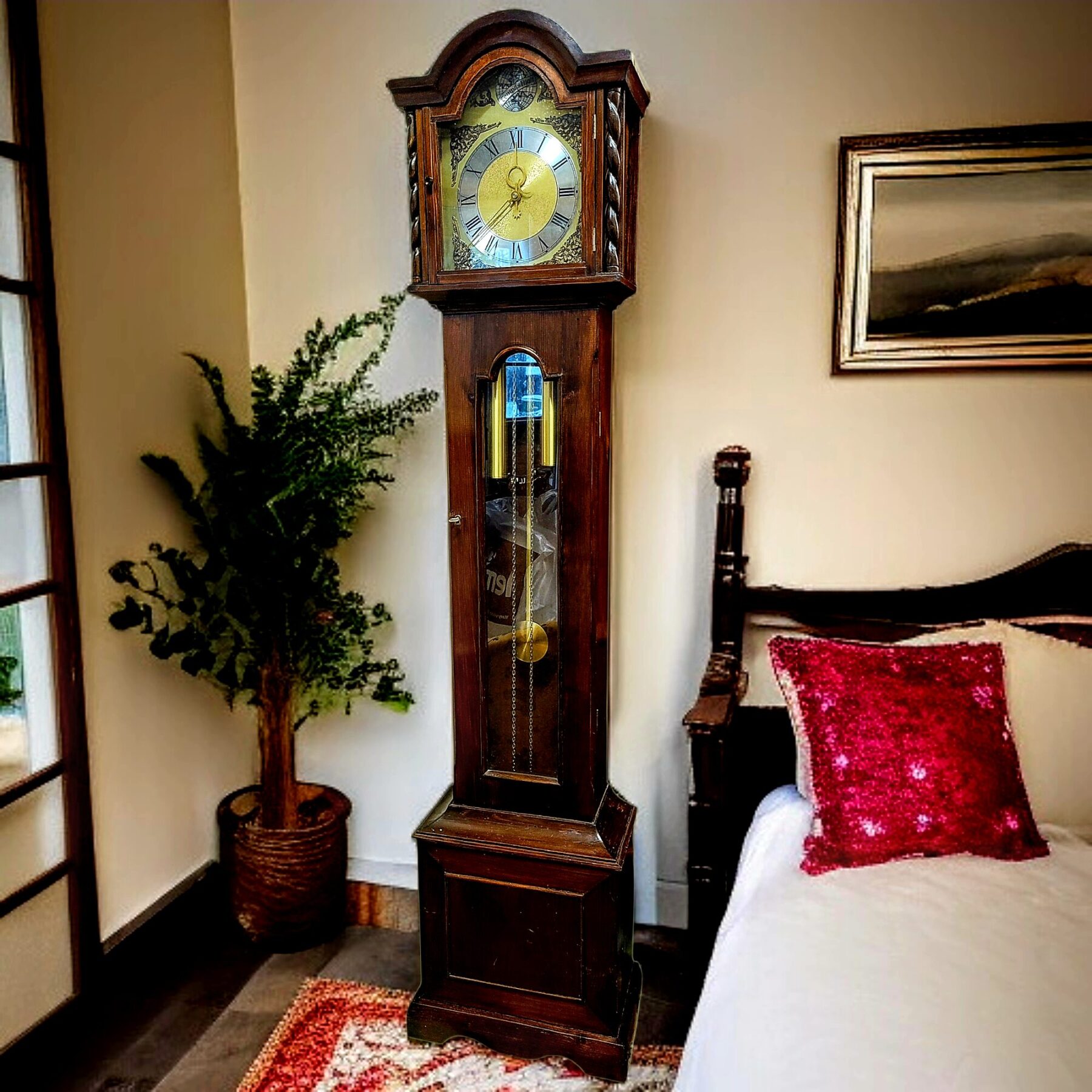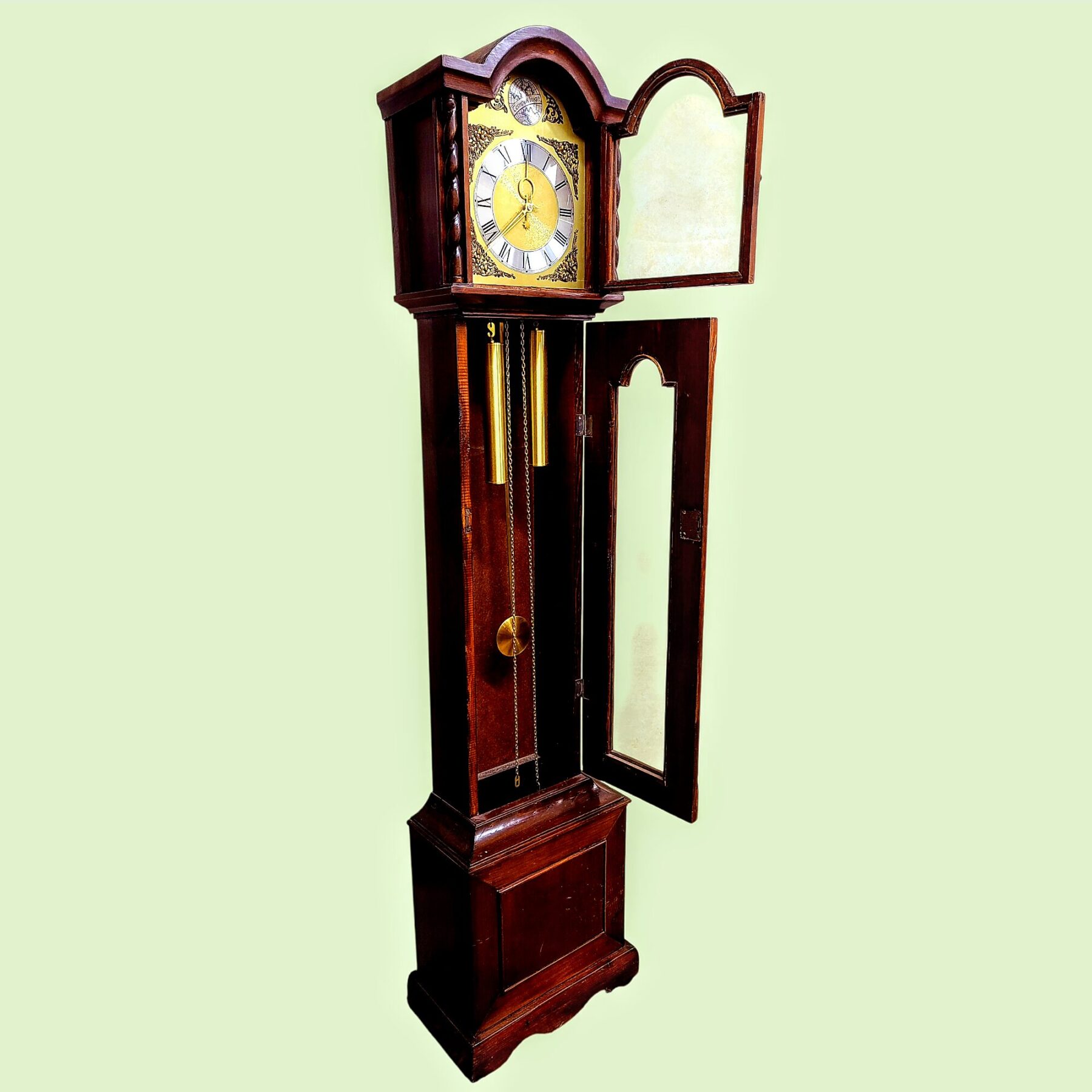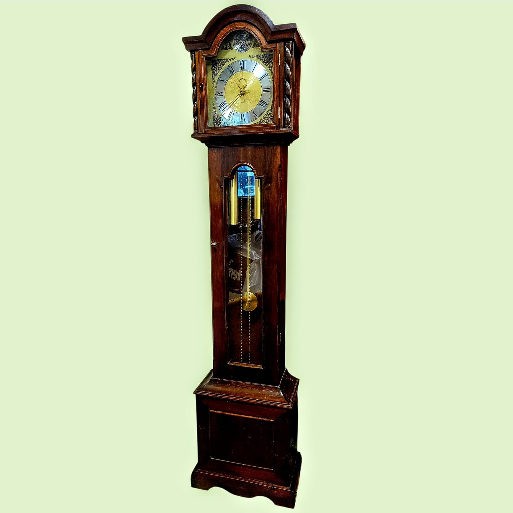 Väärikas põrandakell seisab nagu vaikne tunnistaja möödunud aastakümnetele. Tume puitkorpus, klassikaline kuju ja kuldse helgiga kaalud loovad tunde, justkui oleks aeg siin peatunud. Sihverplaadil seisab ladinakeelne meeldetuletus Tempus fugit – aeg lendab – ning iga pilk kellale kutsub hetkeks peatuma.