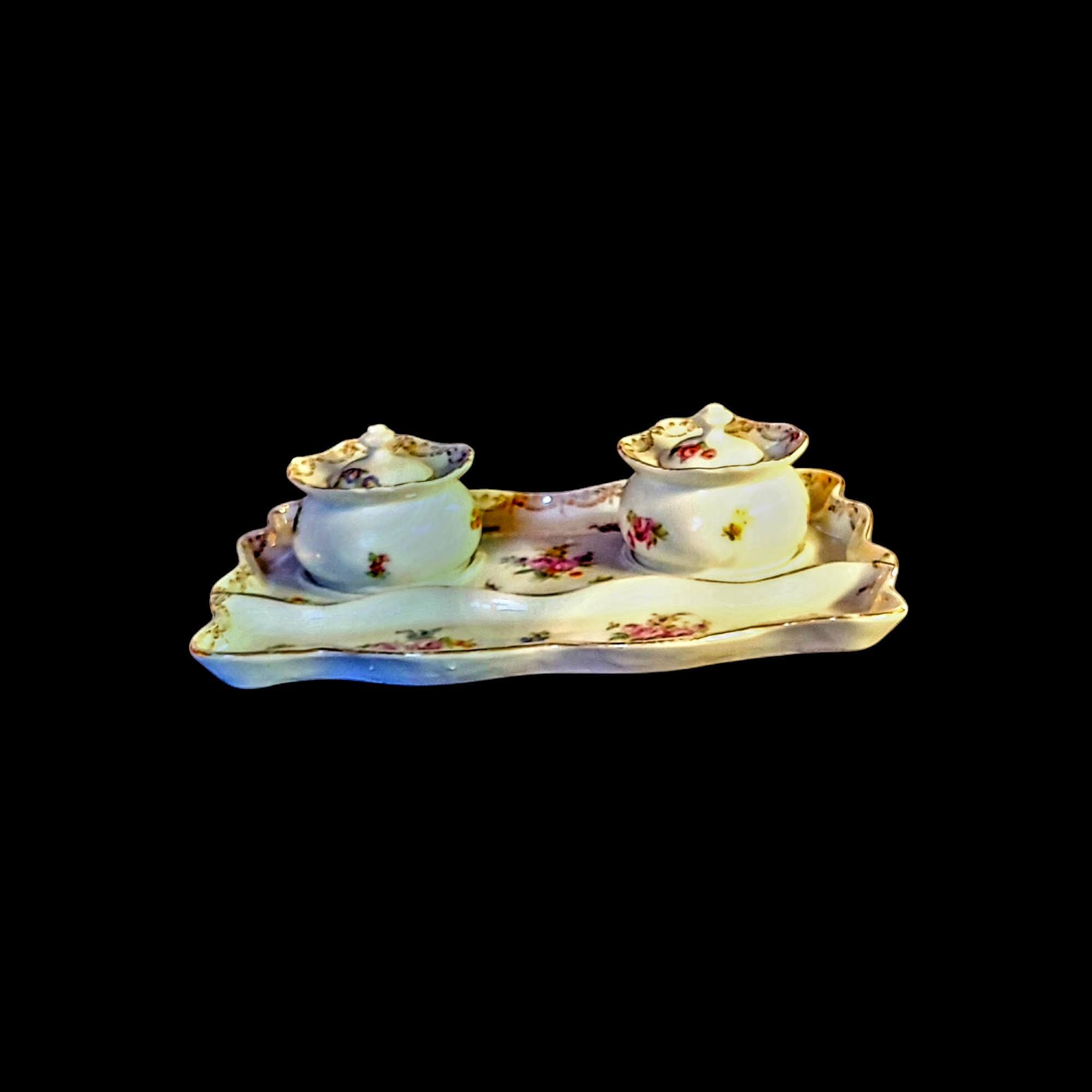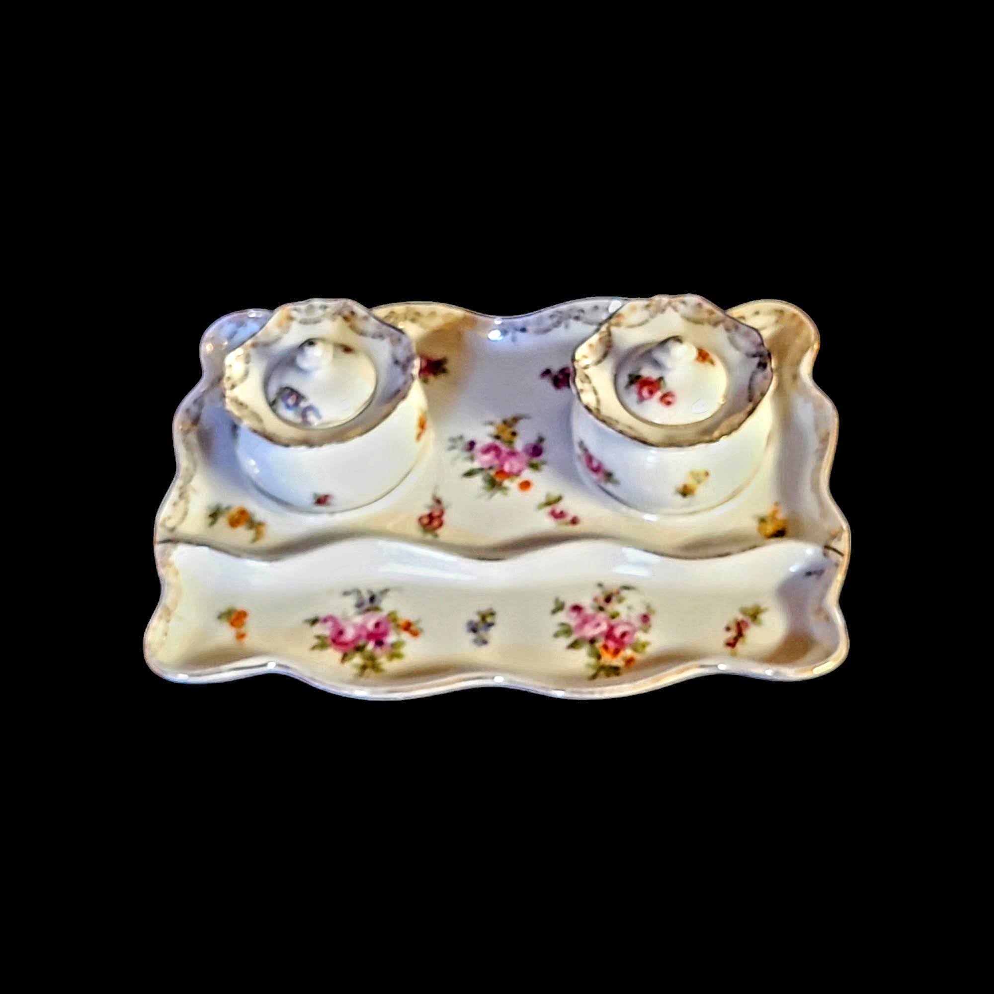 Õrna Meisseni lillekimbu motiividega ajatu portselanist lauagarnituur. Kaunis disain lisab lauagarnituurile võluvat romantikat ja toob esile portselani peene ilu. Komplekt koosneb kahest kaanega tindipotist ja elegantsest lainelise äärega alusest.