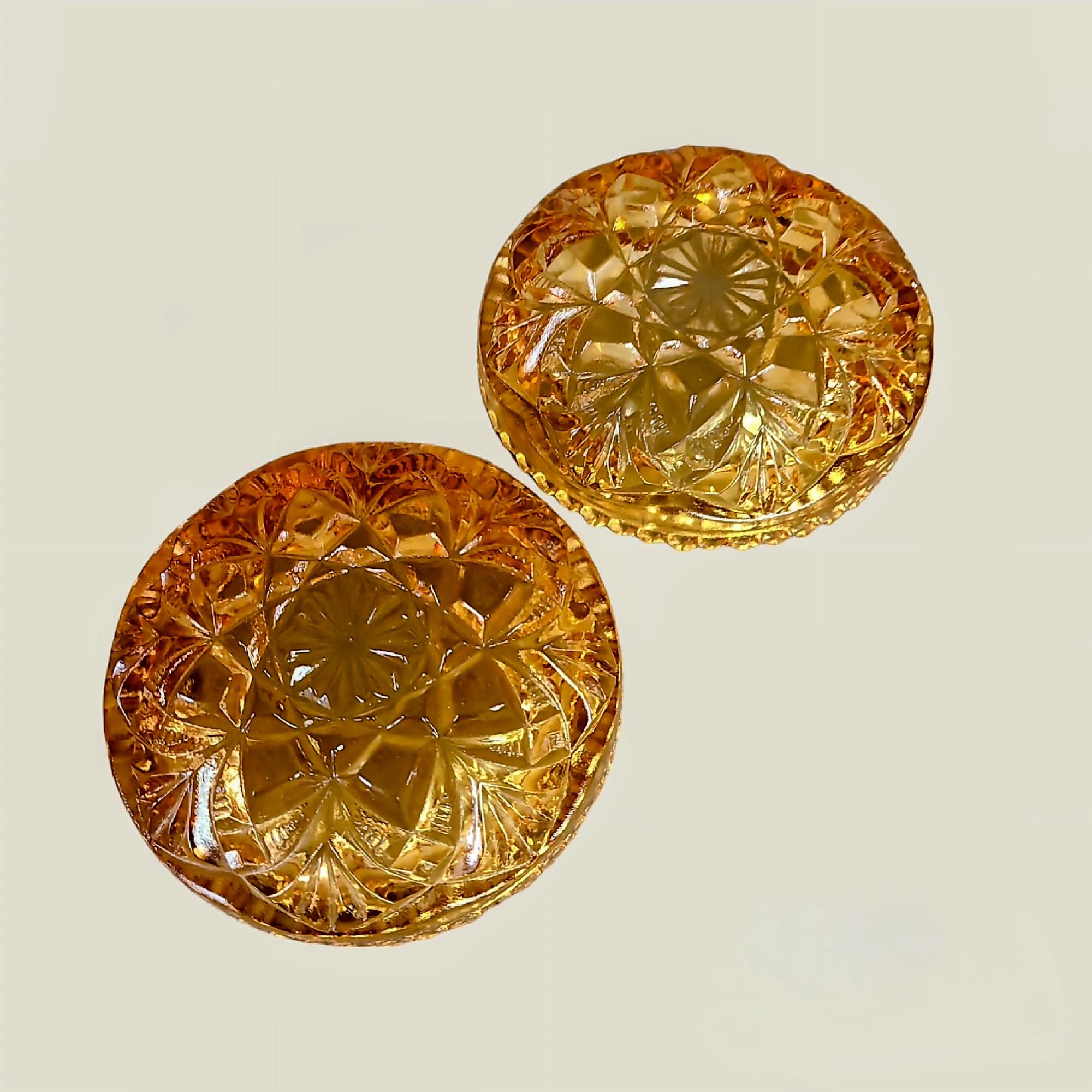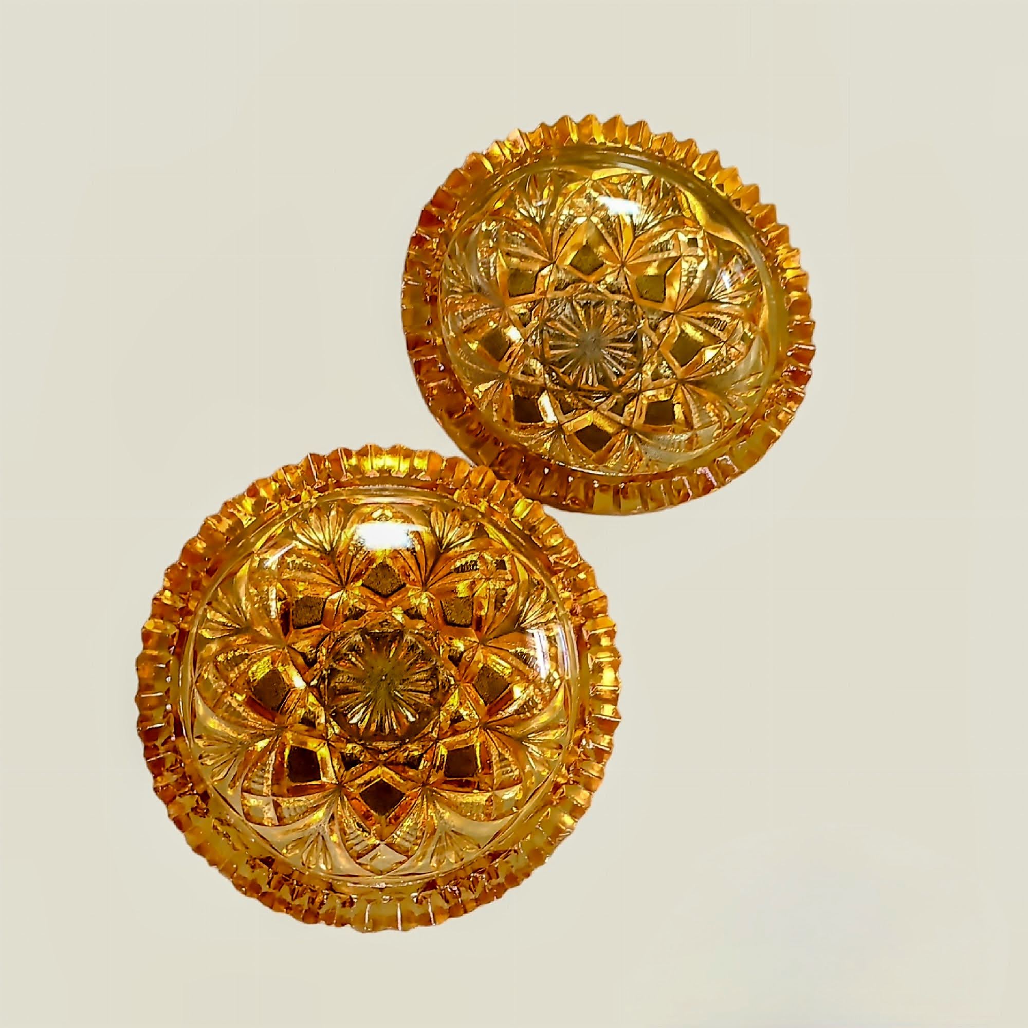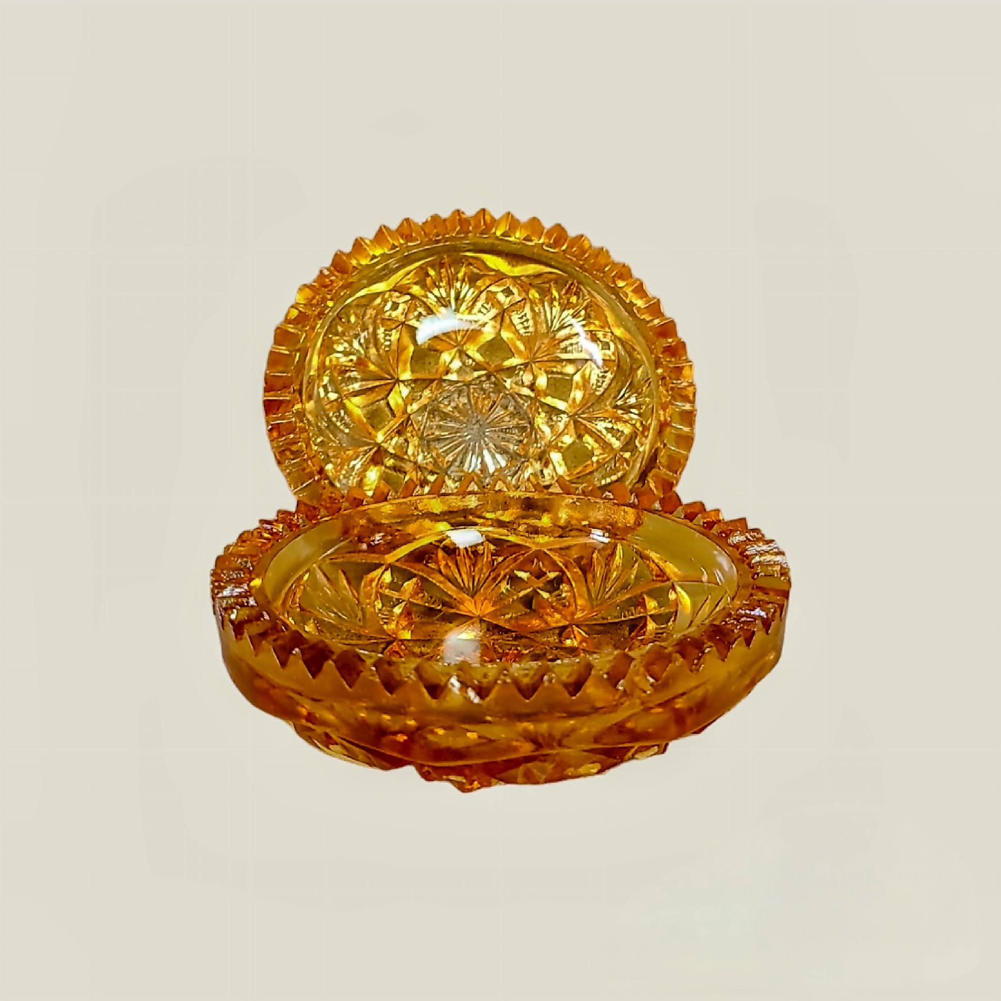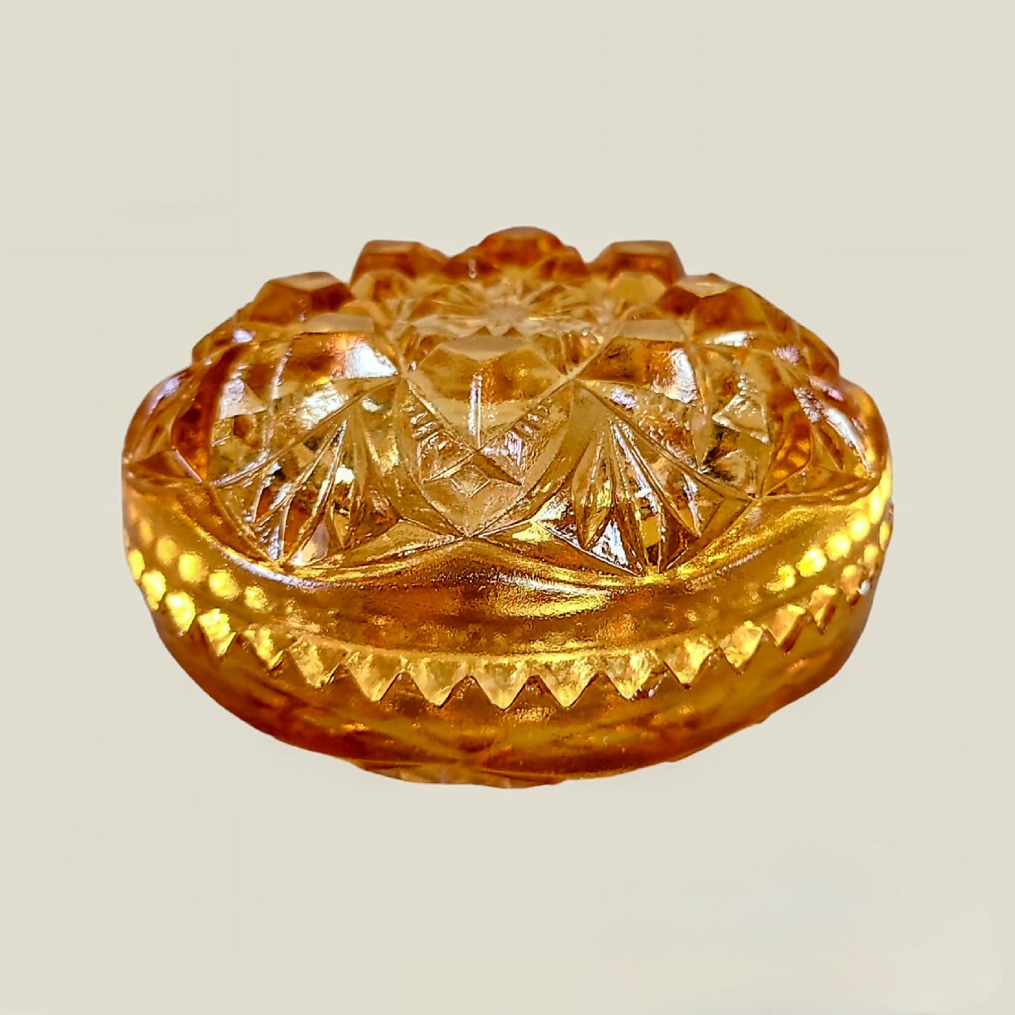 Meistriteos on pärit Ameerika Ühendriikidest 70ndatest, särav merevaigu toon ja saehamba servaga detailid annavad sellele erilise sära, mis kindlasti tõmbab pilku. Klaasist toos ei ole mitte ainult silmapaistev dekoratiivelement, vaid ka praktiline. Sobib suurepäraselt väikeste aarete, ehete või muude armsate esemete hoidmiseks. Kasuta kena lisandina peeglil või kummutil. Tänu oma mitmekülgsusele võib see olla ka suurepärane kingitus neile, kes hindavad ajaloolist võlu.