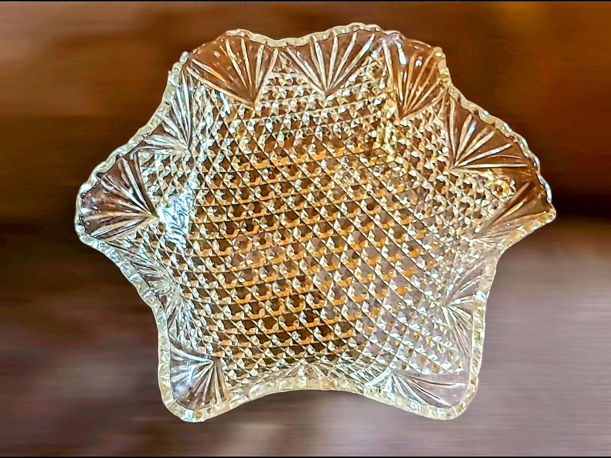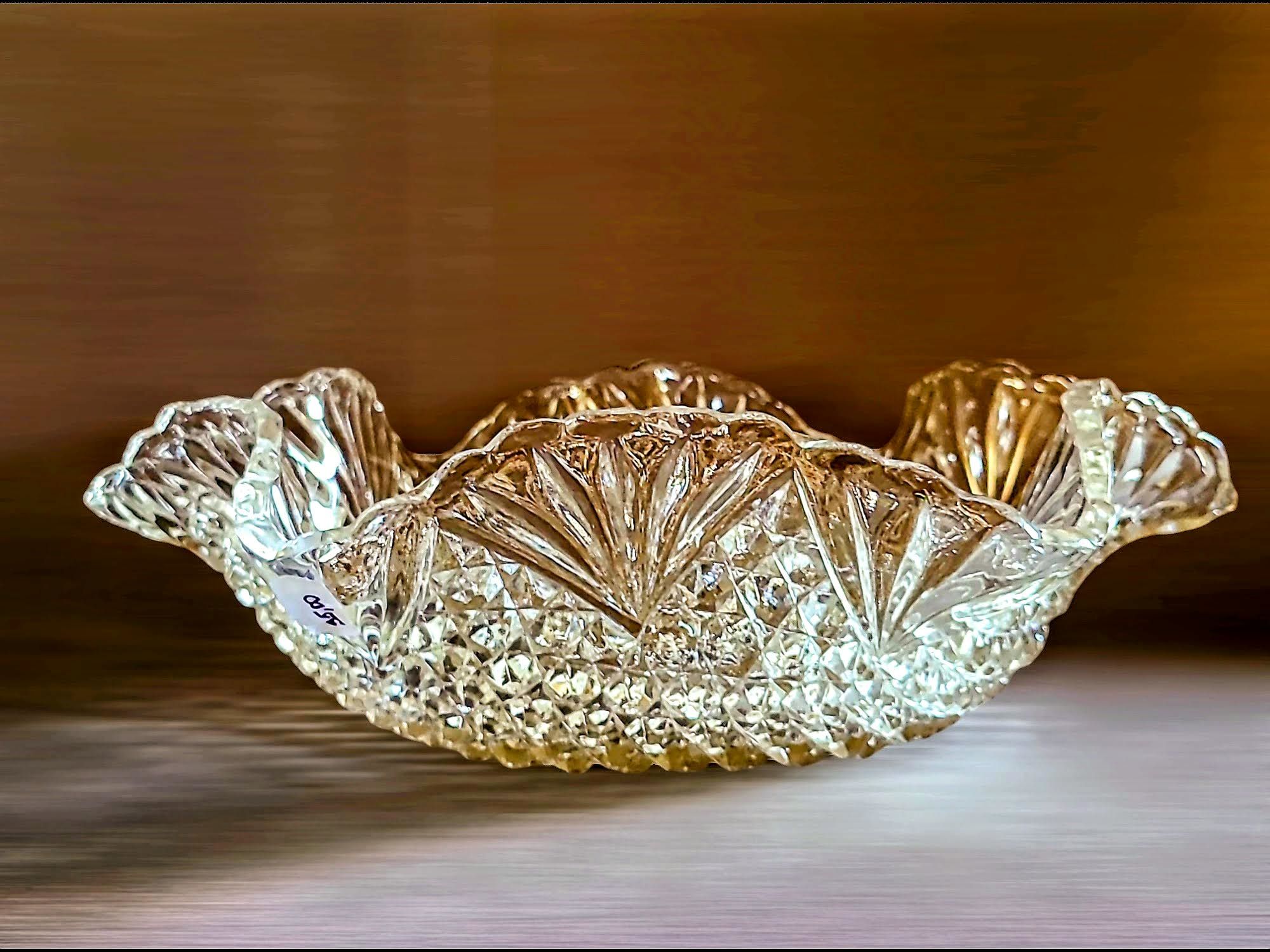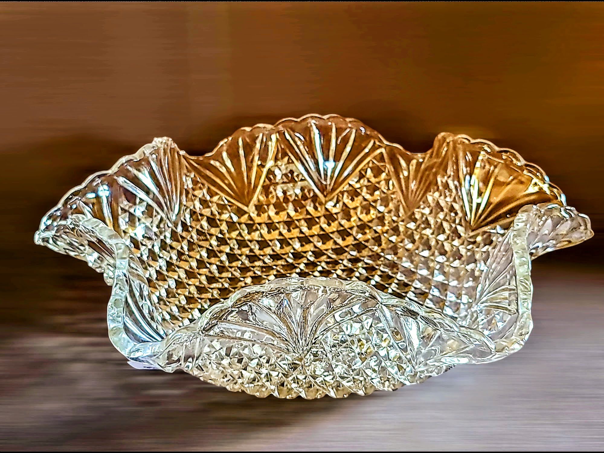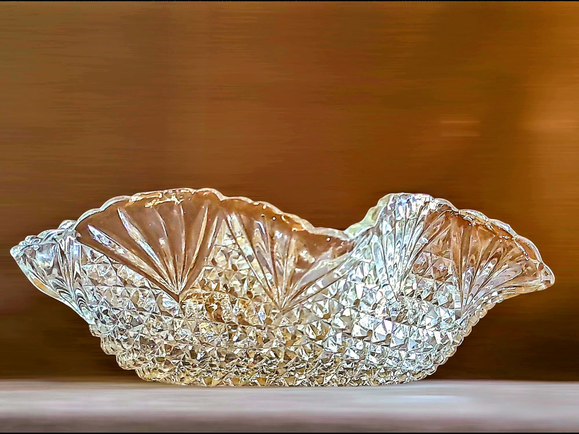 Kaunis pressklaasist vaagen, mille pehmed voolujoonelised servad püüavad pilku oma ajatu elegantsiga, lisades interjööri rahuliku ja väärika ilu. Vaagna pind on kaunistatud peene teemantmustriga, mis lisab luksuslikku sära. Valguse peegeldumine klaasi pinnalt loob kauni mängu ja toob esile selle särava kalliskivi meenutava läike.