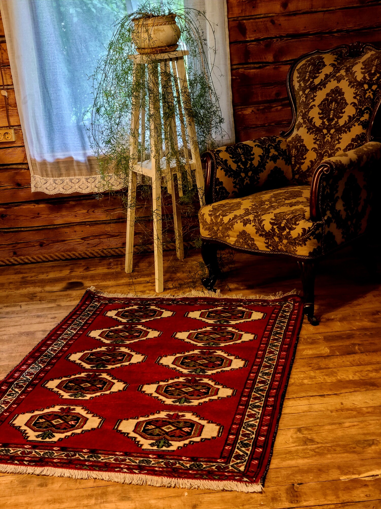 Kujutle vaikset pärastlõunat vanas talumajas. Päike sillerdab läbi pitskardina, vanaaegne tugitool kutsub puhkama – ja jalge all lebab just see punane vaip, mis ühendab mineviku soojuse ja romantika tänapäevase hubasusega.