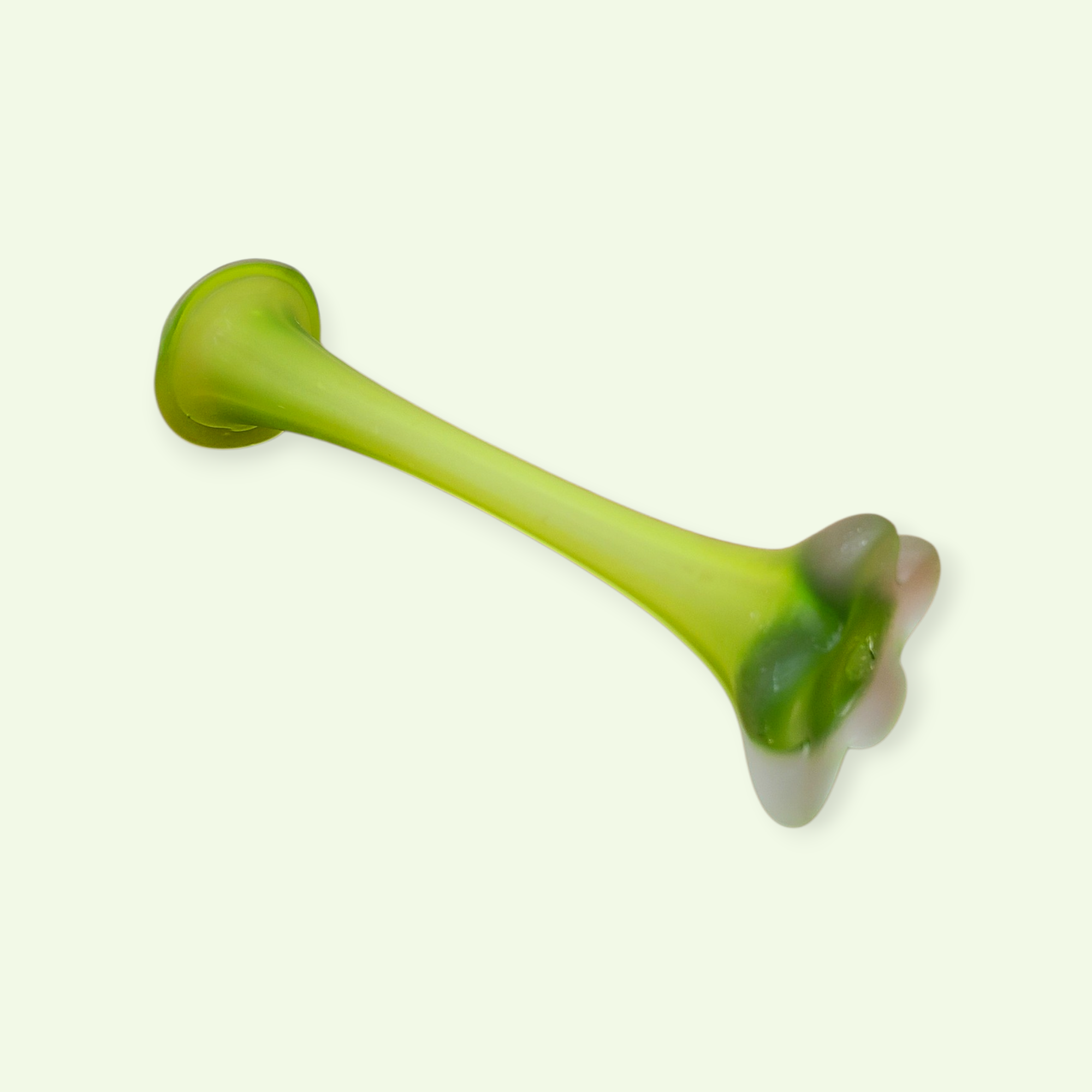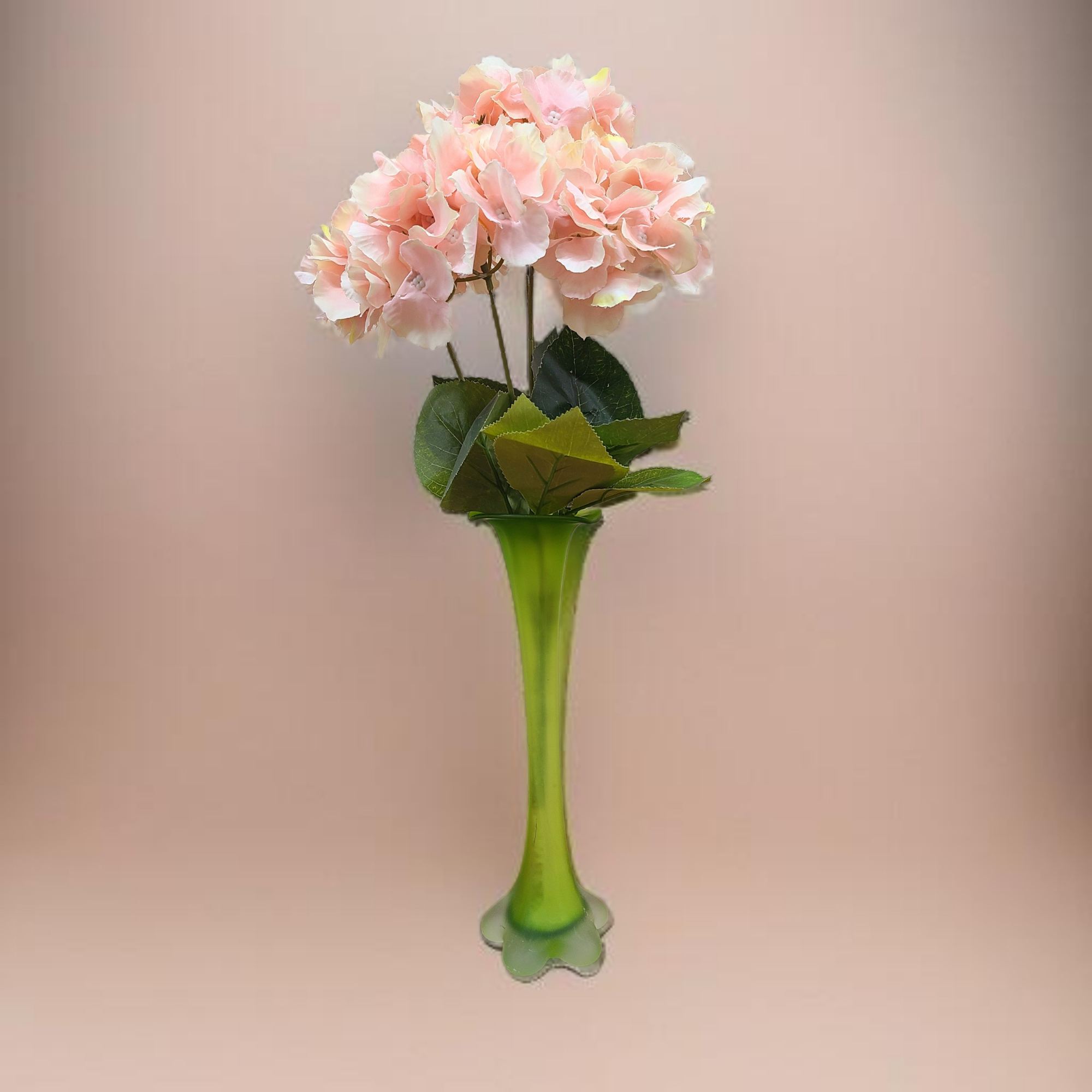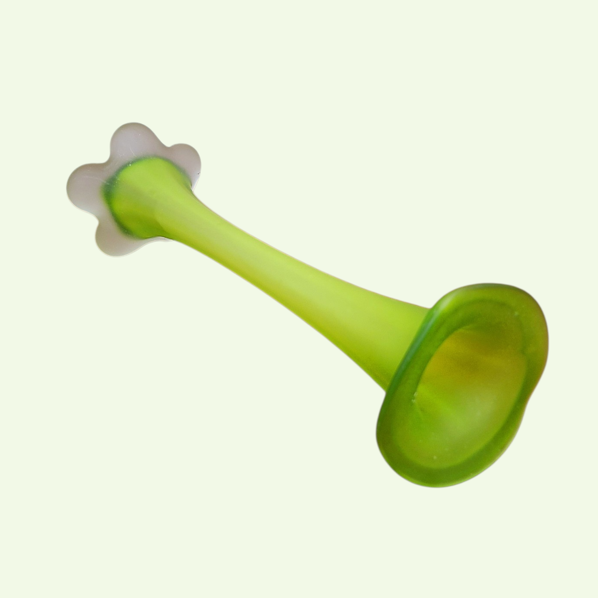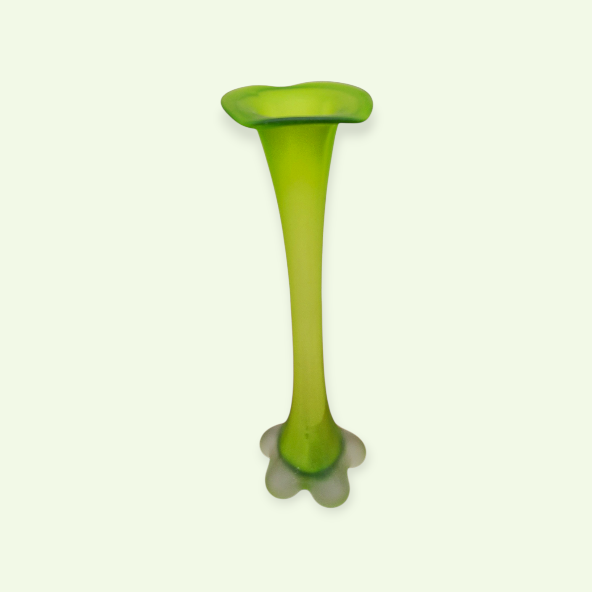 Vaasi sihvakas kael kannab endas ajastu elegantsi, samal ajal kui lilleõit meenutav jalg annab vormile kindla, ent mängleva tasakaalu. Valgus murdub klaasis pehmelt, muutes rohelise tooni kord sügavamaks, kord helgemaks.