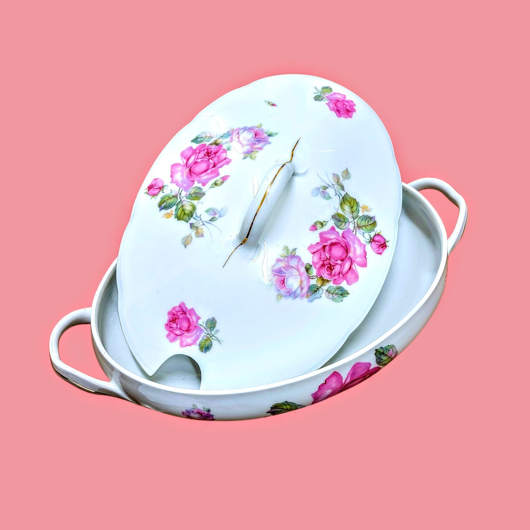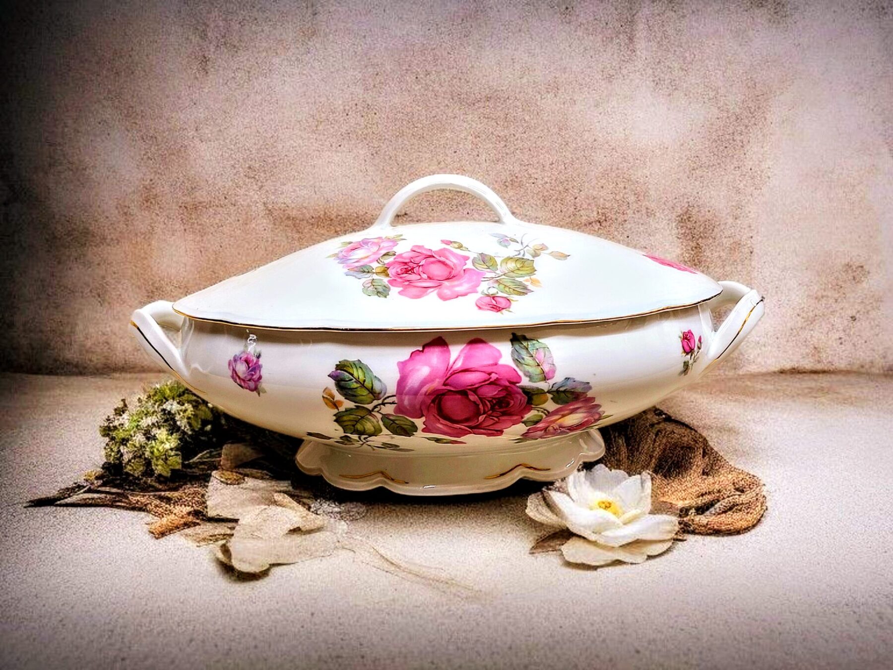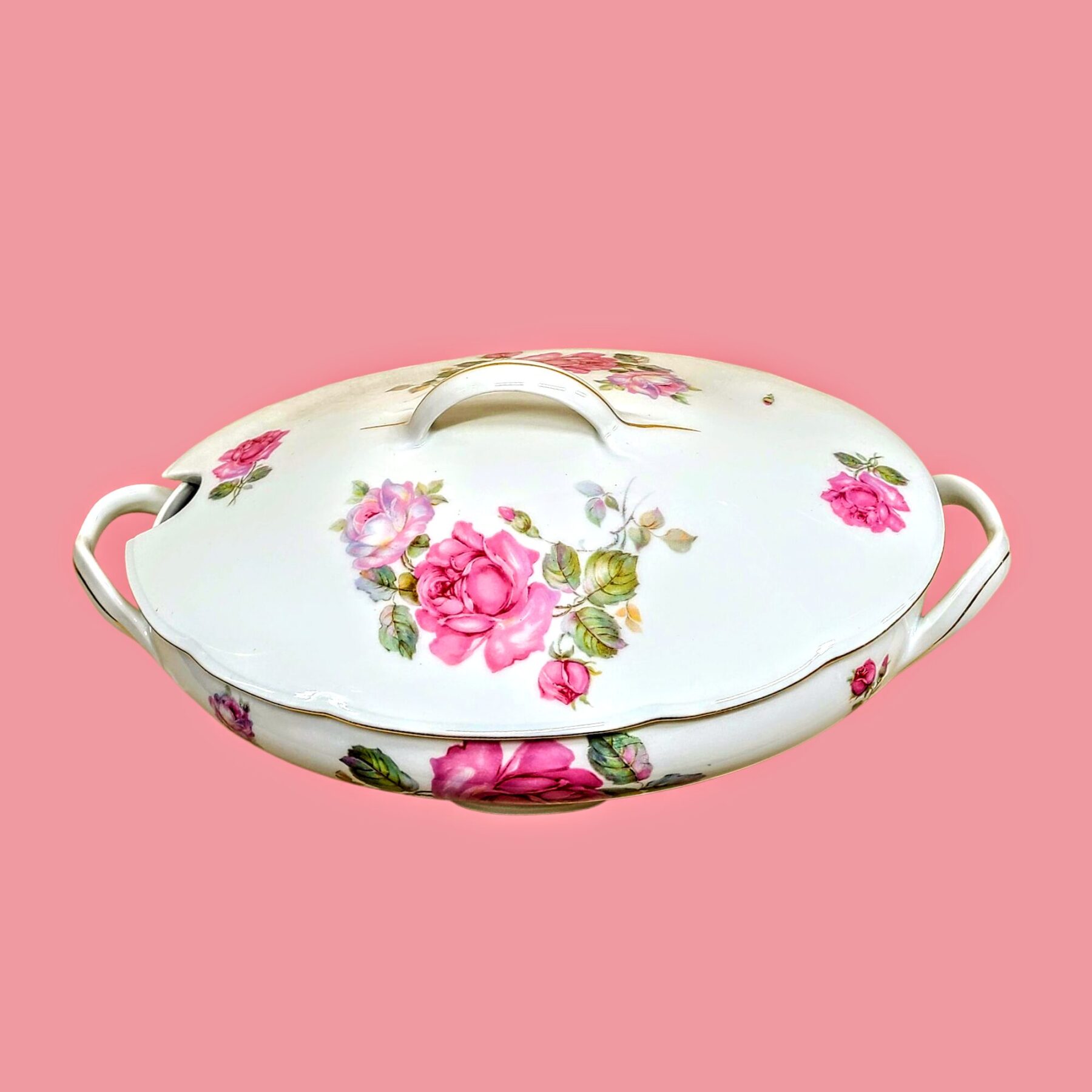 Roosimuster, mis oli 20. sajandi esimeses kolmandikus väga armastatud, annab esemele rahuliku, koduse ilme. Kuldjooned äärel, kaanega ülaosa ja kaks käepidet loovad terviku, mis mõjub ühtaegu praktilise ja väärikana.