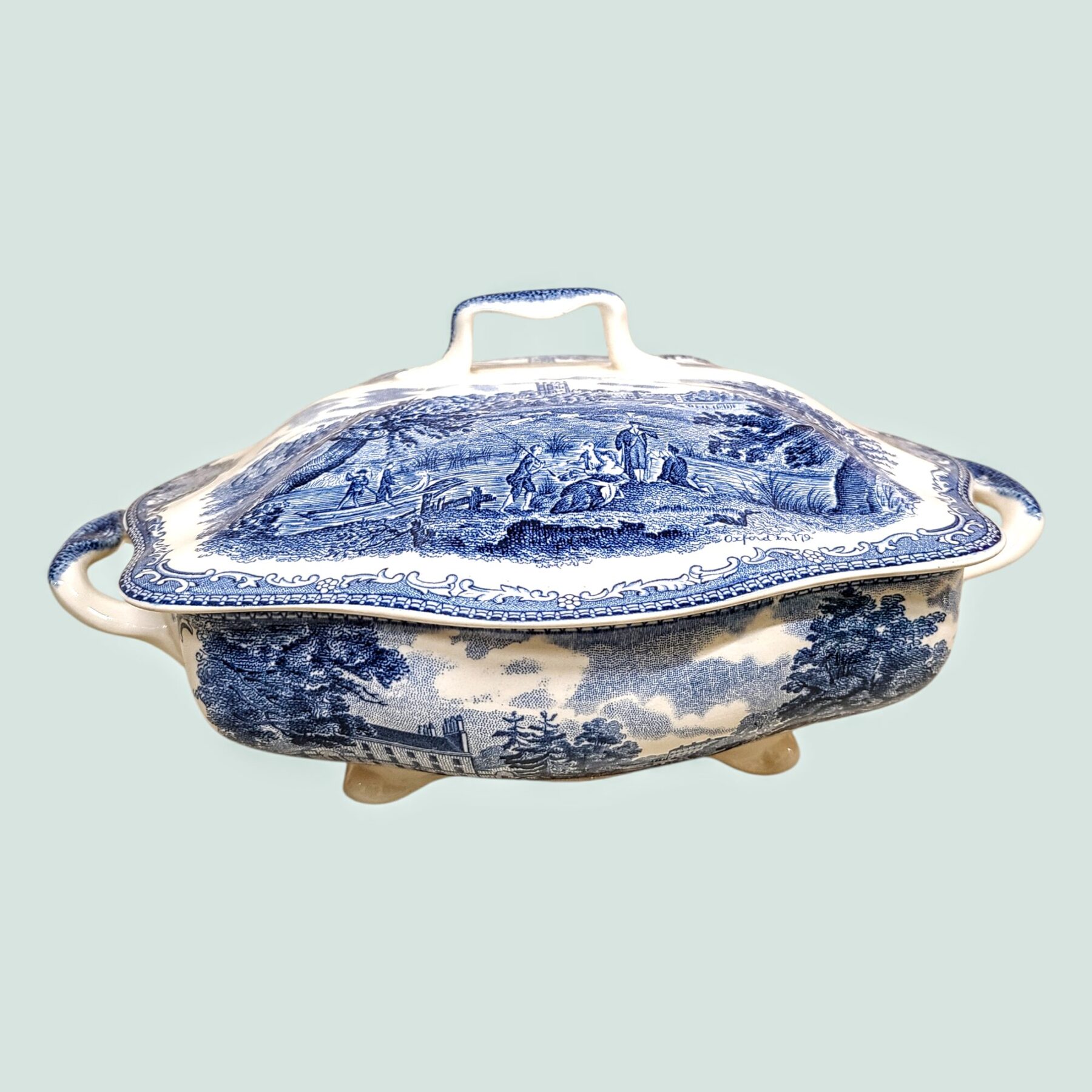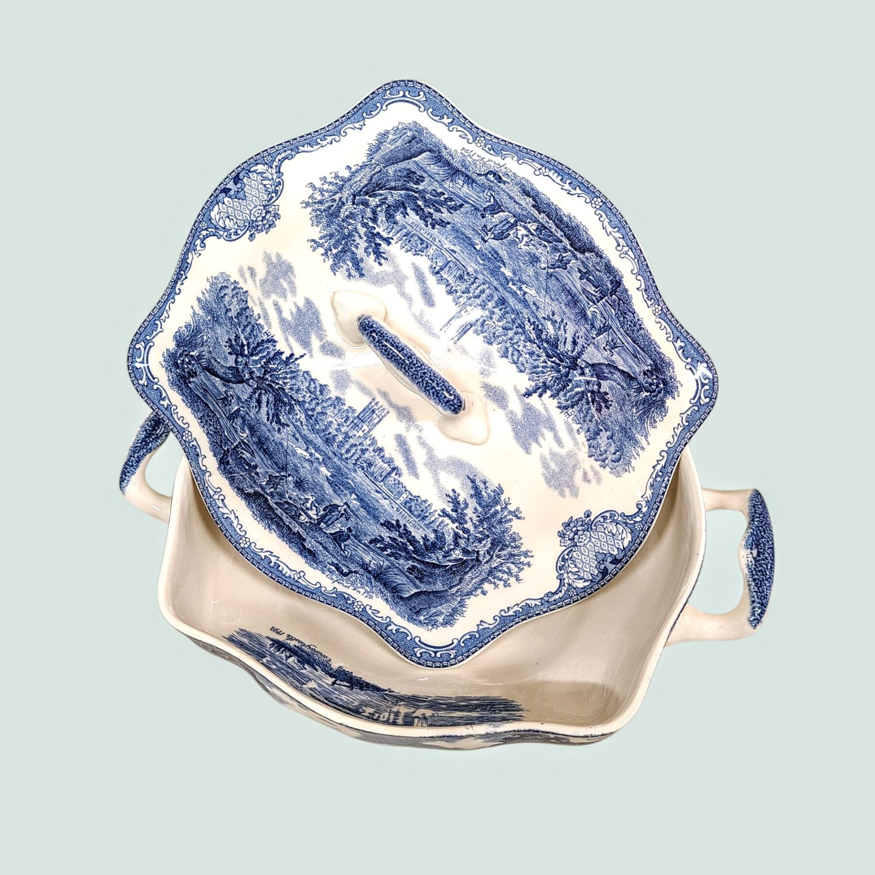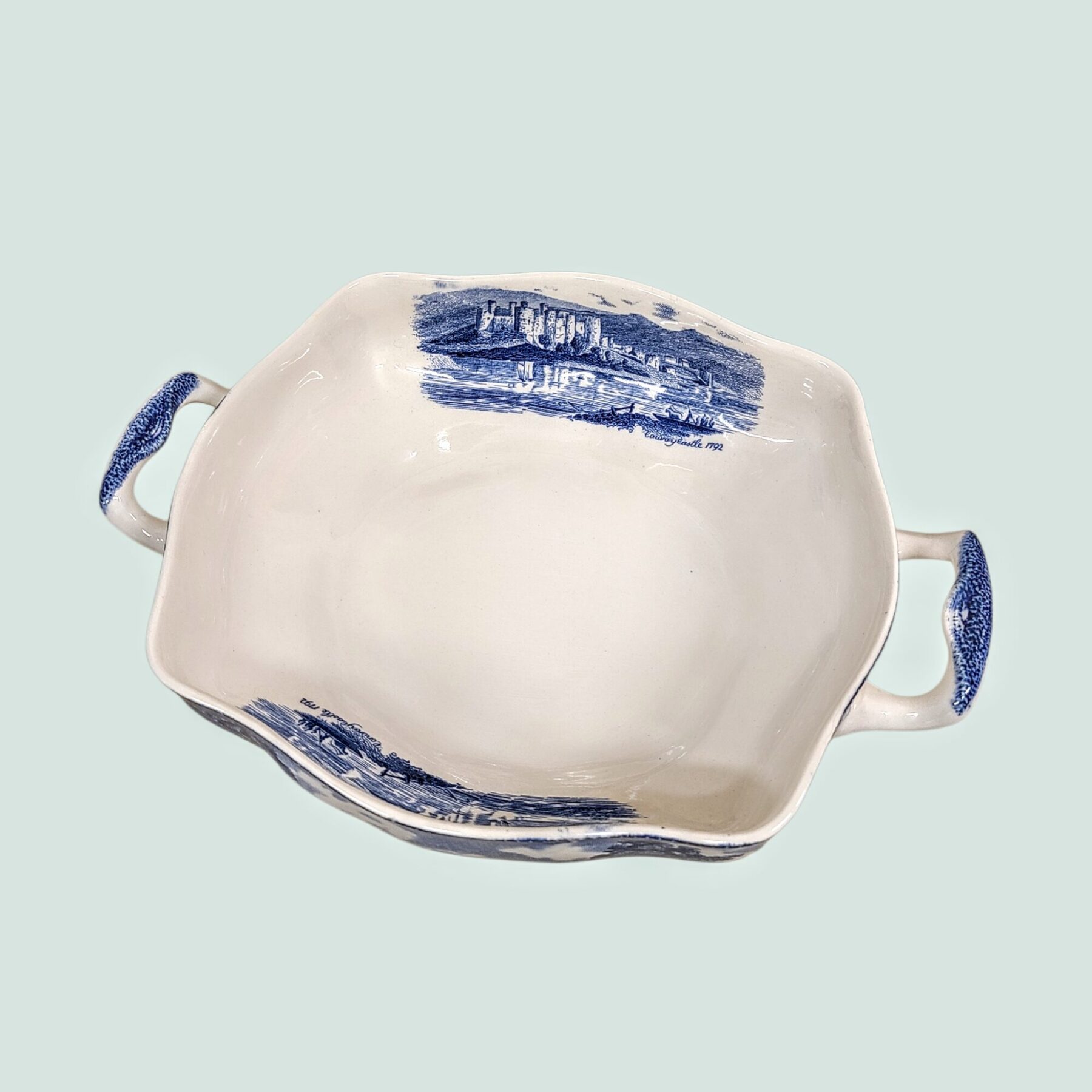 Sinivalge Johnson Bros “Old Britain Castles”  keraamiline tirin Inglismaalt (1930–1940ndad). Klassikaline vintage-lauanõu vanade losside romantikaga.