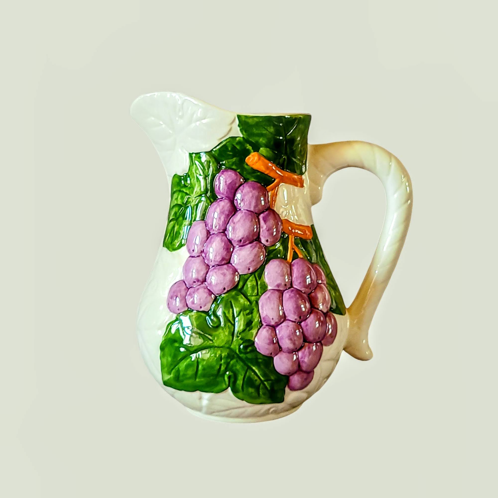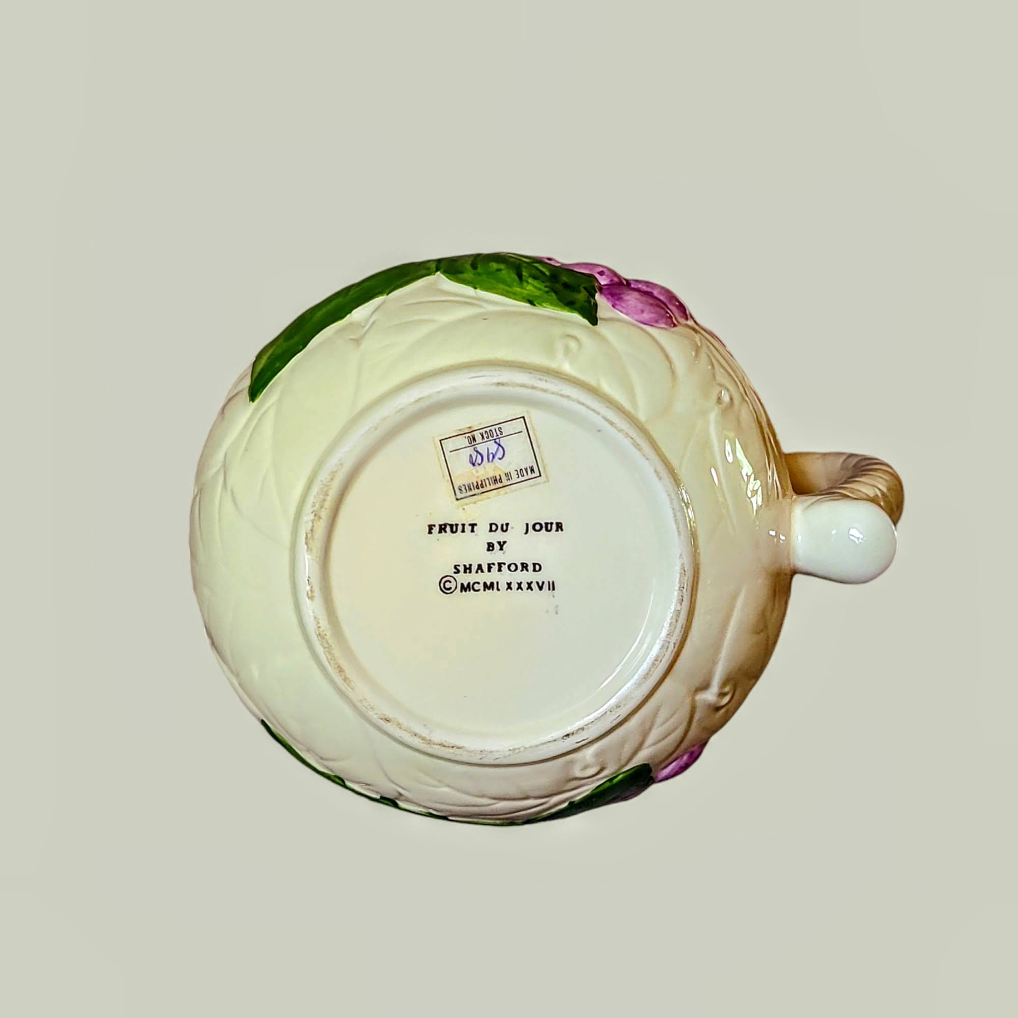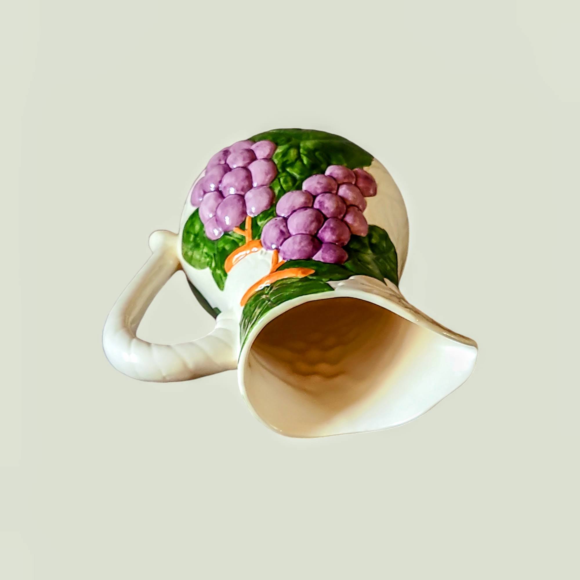 Võluv vintage “Fruit du jour” Shafford suur keraamiline kann, pärineb 1980.–1989. aastatest. Imekaunis kreemjas kann, mida kaunistavad reljeefsed viinamarjakobarad on pilkupüüdev ja eriline täiendus igas kodus.