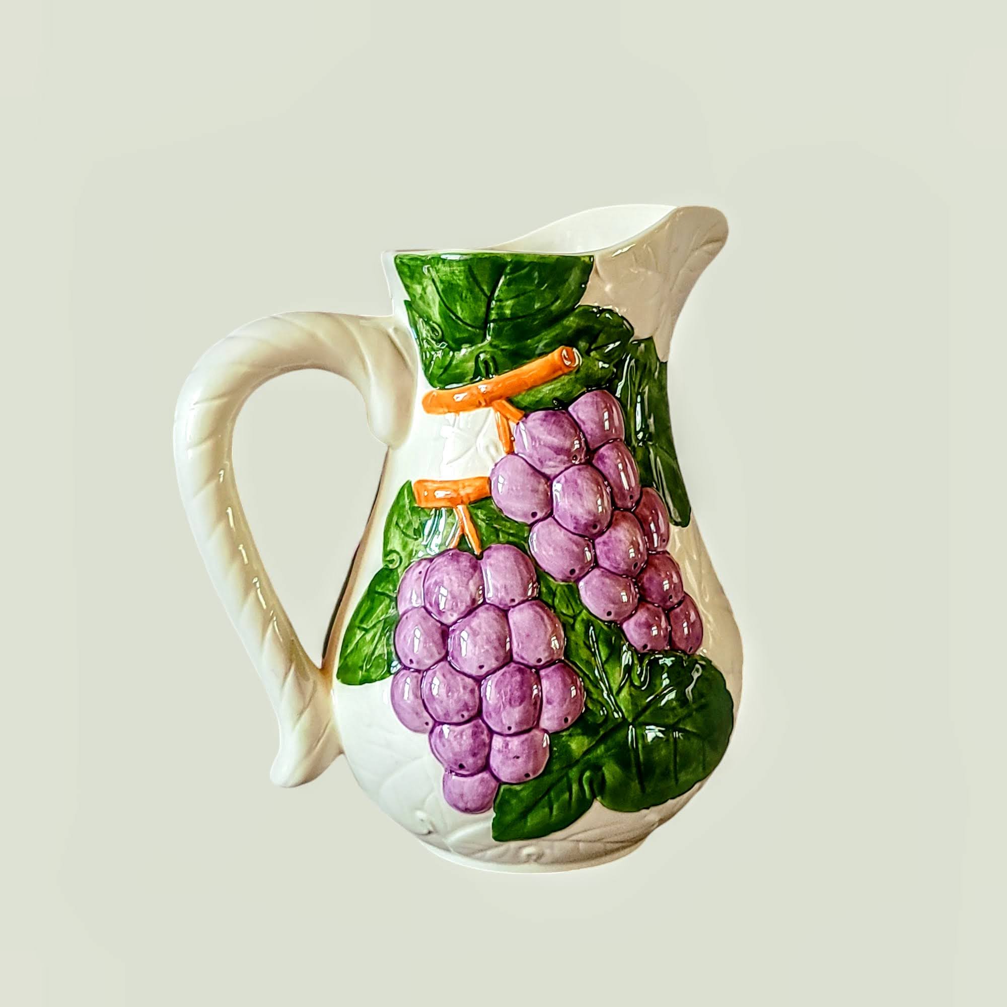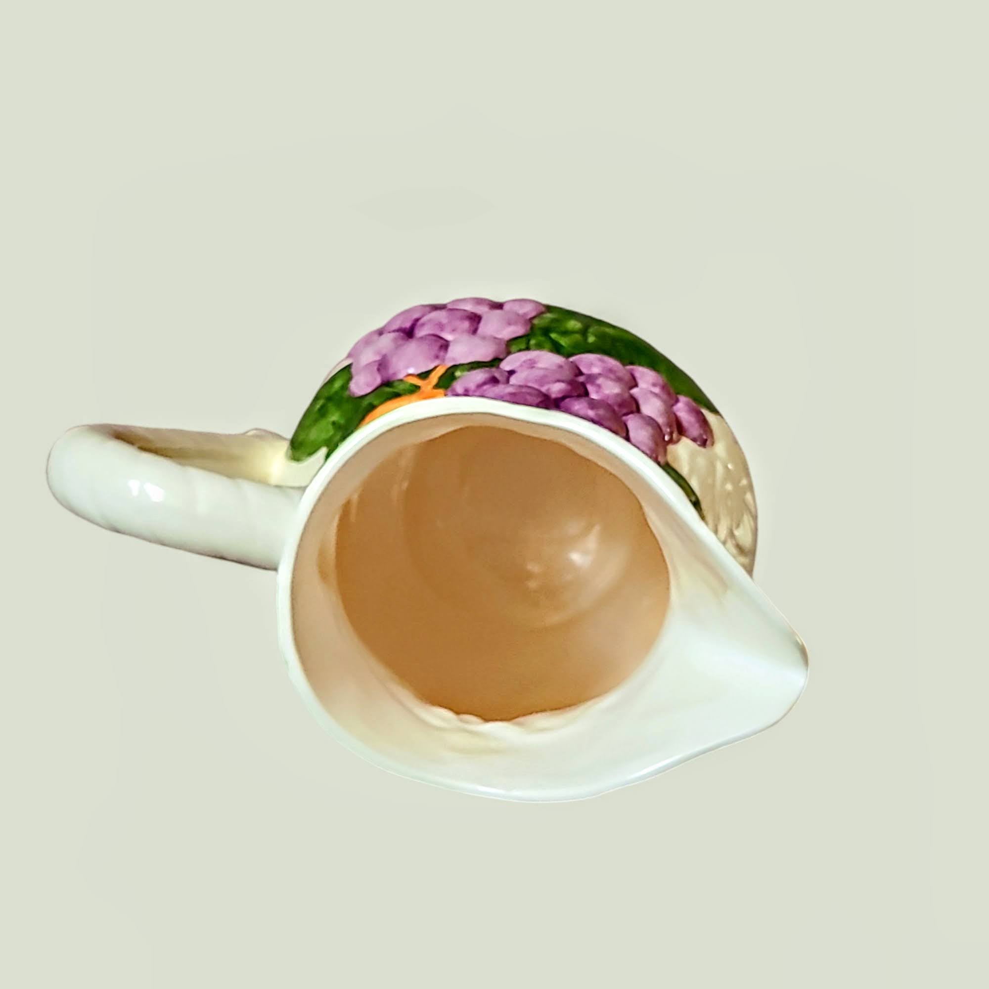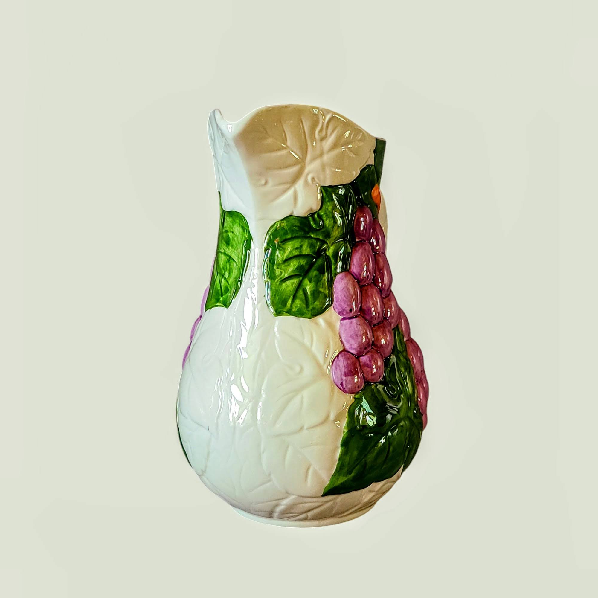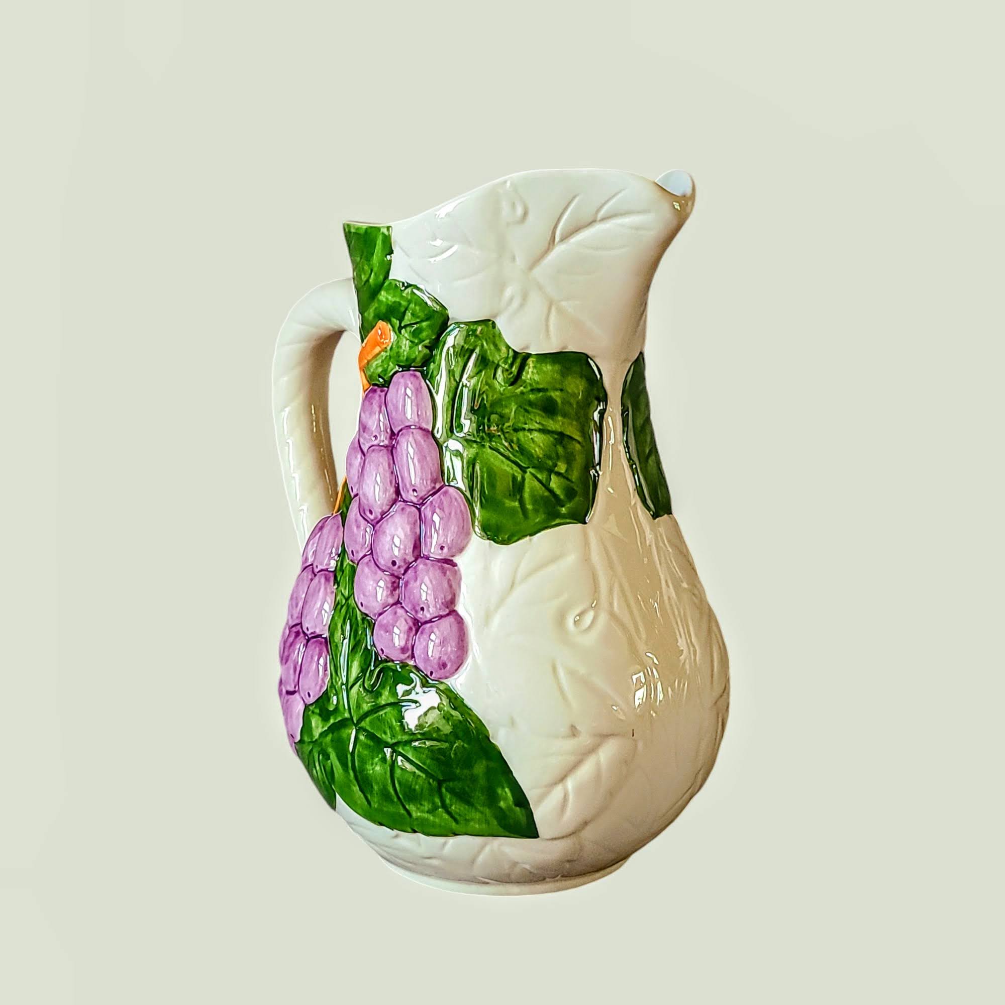 Võluv vintage “Fruit du jour” Shafford suur keraamiline kann, pärineb 1980.–1989. aastatest. Imekaunis kreemjas kann, mida kaunistavad reljeefsed viinamarjakobarad on pilkupüüdev ja eriline täiendus igas kodus.