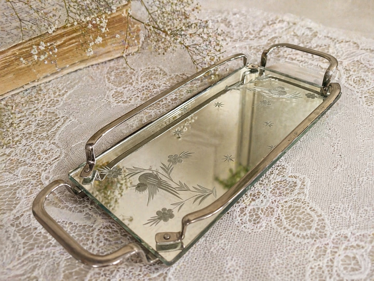 Romantilise graveeringuga muster peegelklaasil justkui sosistab lugusid aegadest, mil päev algas omas rütmis. Päikese valgus peegeldub pinnalt, mängides pitsilise laudlina ja kaunite õite varjudega.
