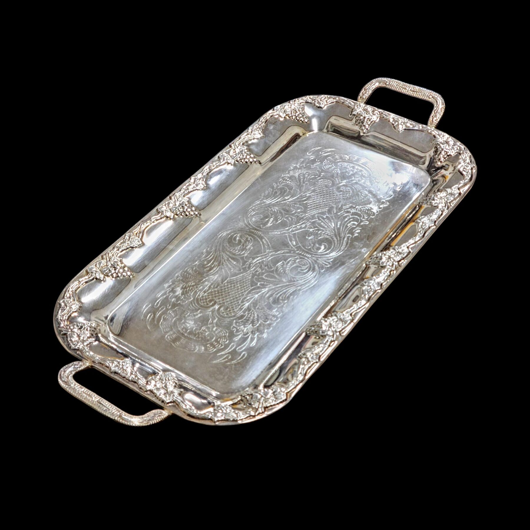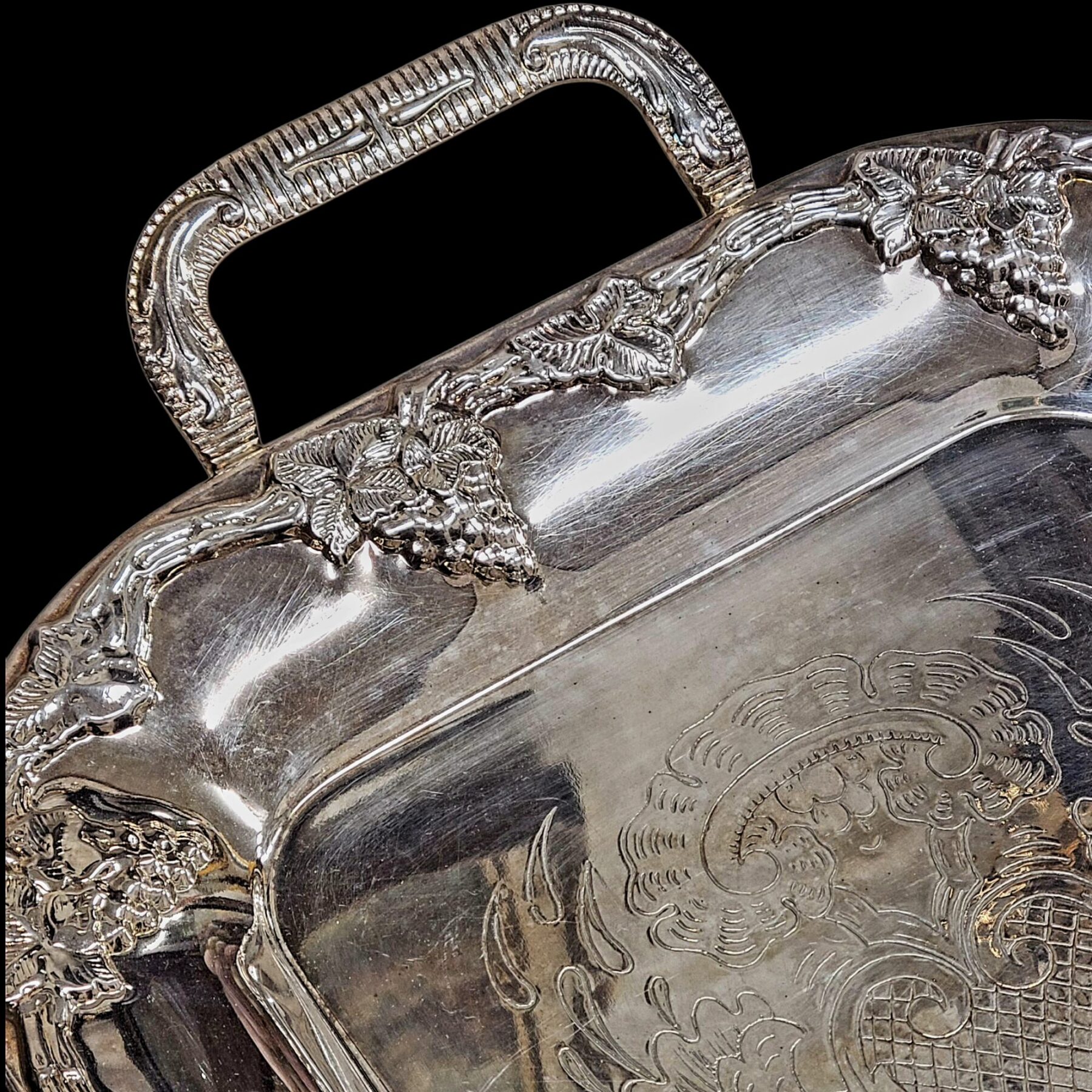 Hõbetatud pind, mis kannab peent, rokokoolikult voogavat graveeringut, näib kumavat nagu vana aja hommikuvalgus, mis peegeldub vastu kristallist veiniklaasi. Kandiku äärt katab rikkaliku viinamarjaväädi motiiv, mis kordab elu igavest rütmi – küpsemist, jagamist ja külalislahkust.