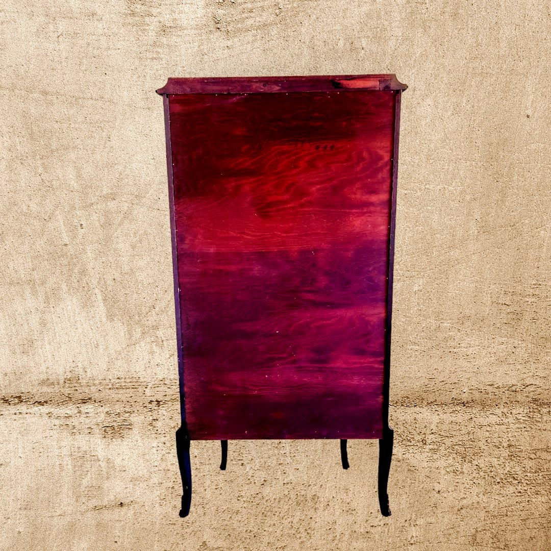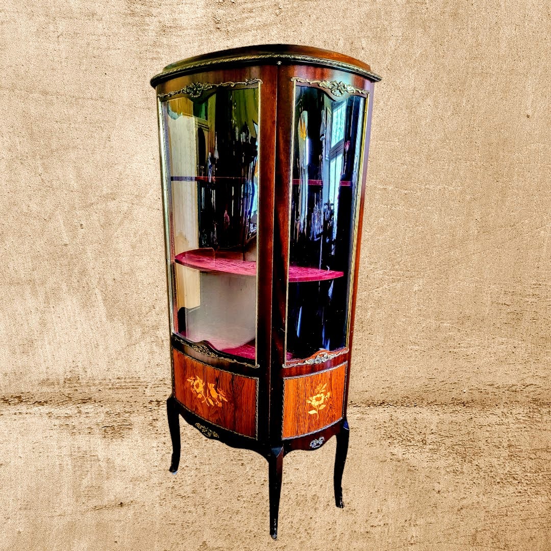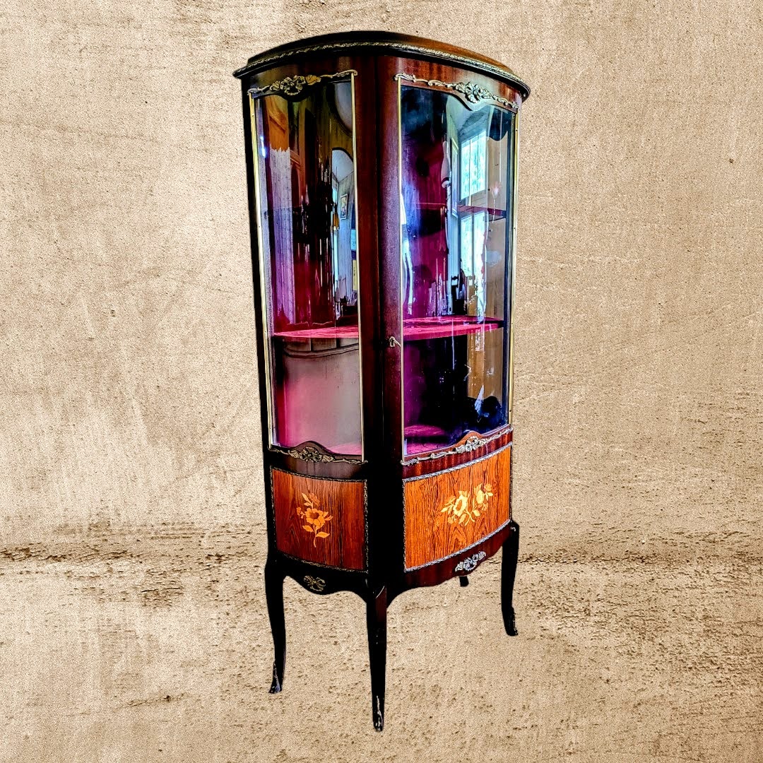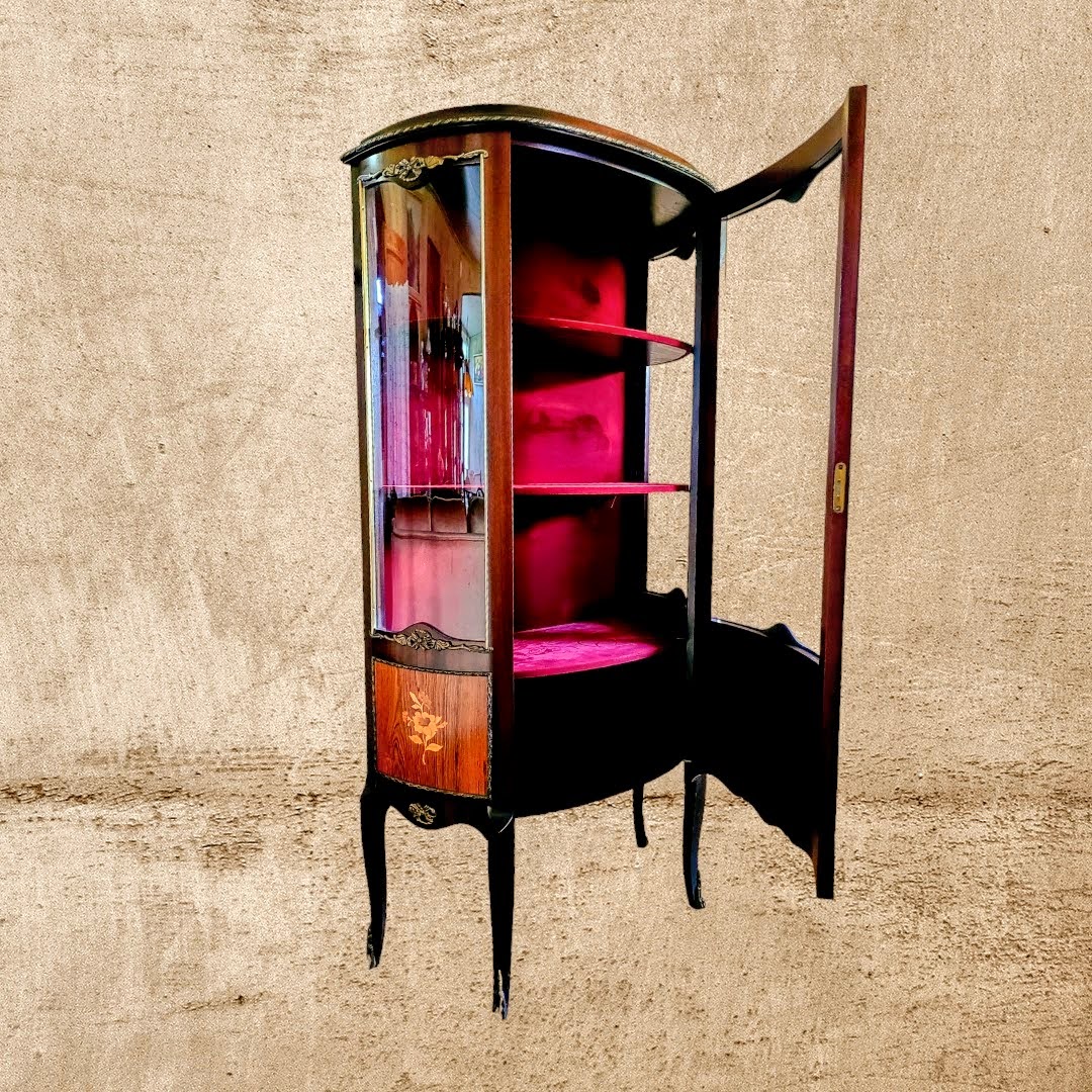 Kapisisene pehme purpurpunane sametkangas lisab luksuslikkuse ja rafineerituse tunnet, pakkudes samal ajal täiuslikku tausta teie kollektsioonile. Vitriinkapp on kaunis meistriteos, mis paistab silma oma särava viimistluse, kaunite intarsiate ja elegantsete messingist furnituuride poolest.