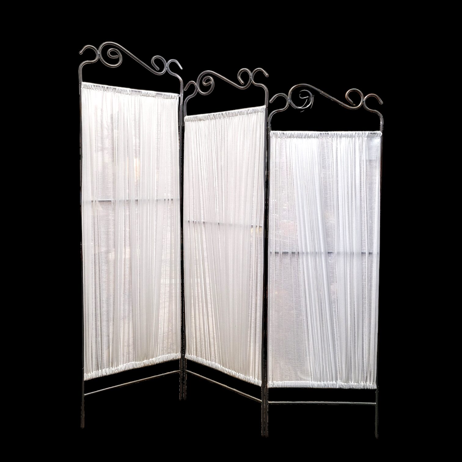 Saleda metallraami vahel langeb hele, poolläbipaistev kangas, mis ei sulge ruumi, vaid loob sellesse pehme piiri. EKNE sirm sobib ideaalselt magamisnurga, riietusala või rahuliku nurgakese loomiseks.