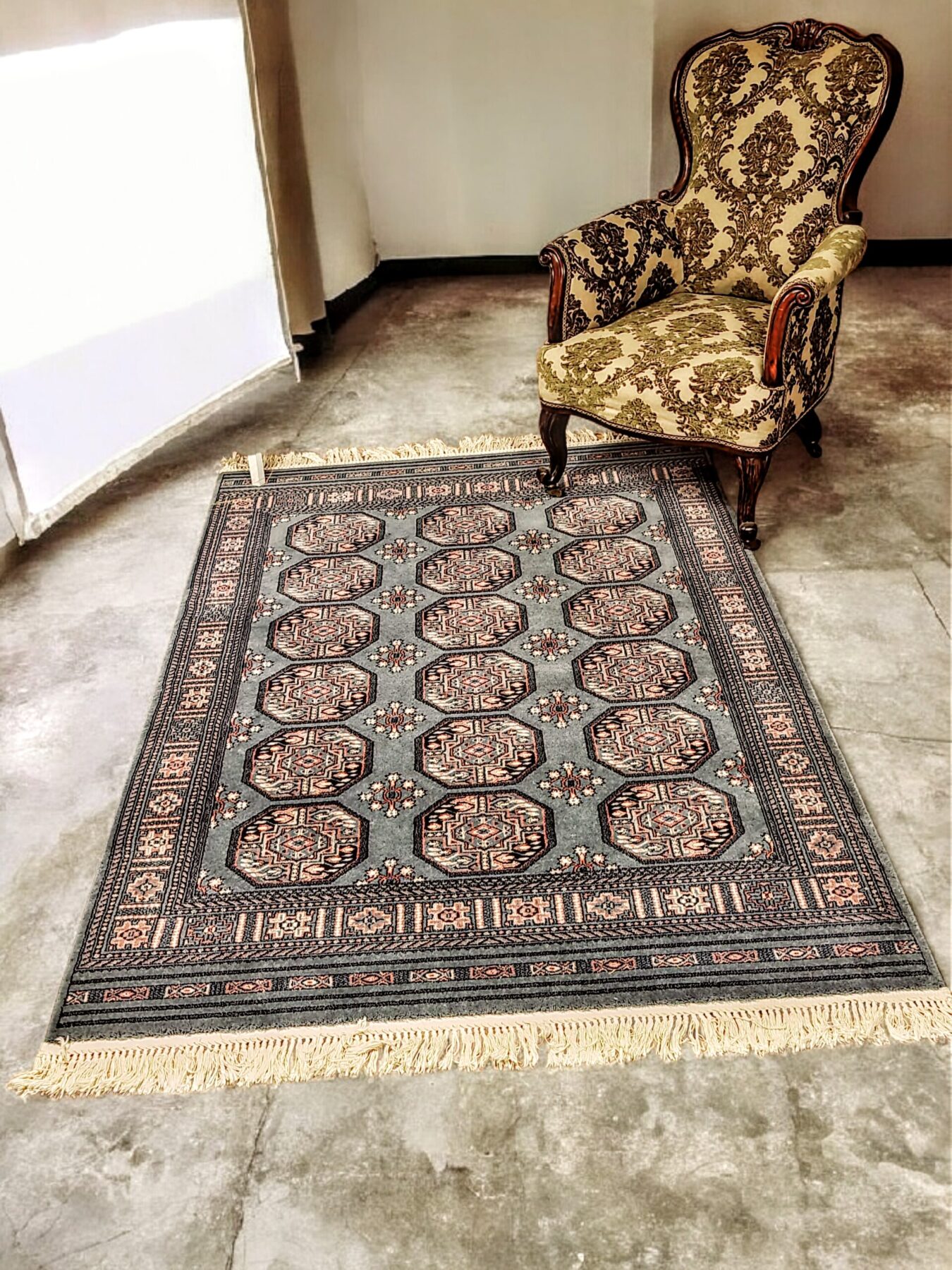 Vaiba sinakasroheline toon meenutab merd varahommikul, kui tuul pole veel ärganud ja maailm hingab omas taktis. Korduvad geomeetrilised medaljonid, inspireeritud klassikalisest Afghani mustrist, loovad oma rütmi mis rahustab pilku.