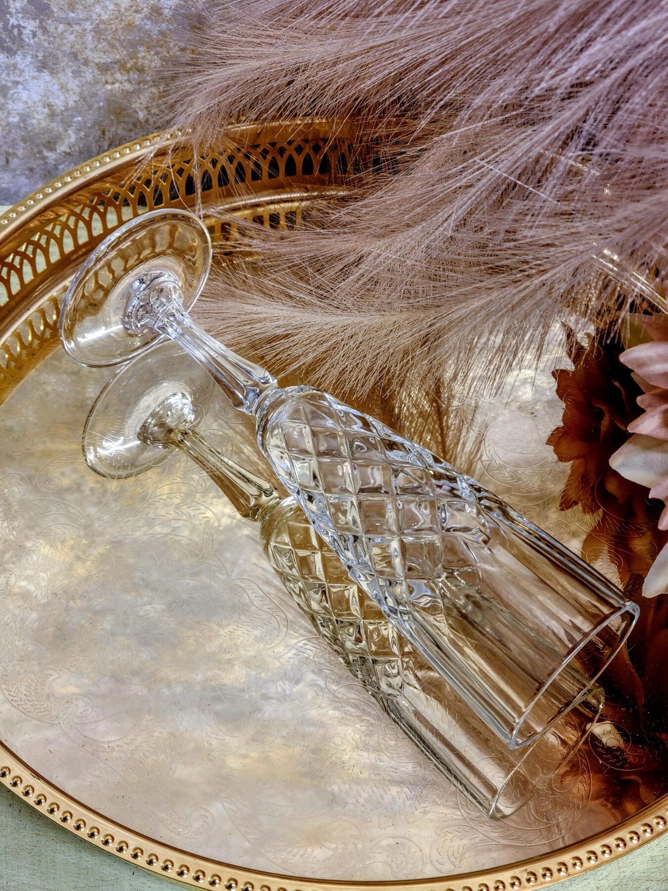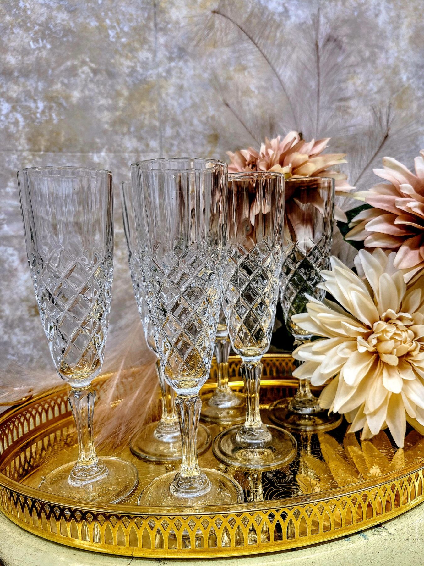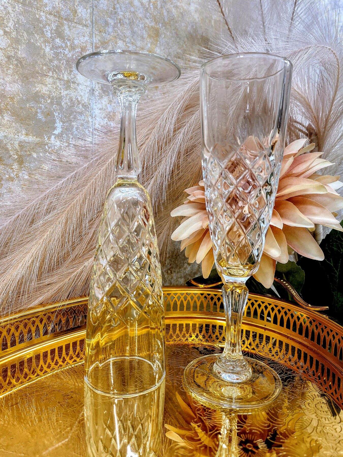 Elegantse teemantmustriga prantsuse šampanjapokaalid – sädelev luksus ja ajatu romantika igal pidulaual.